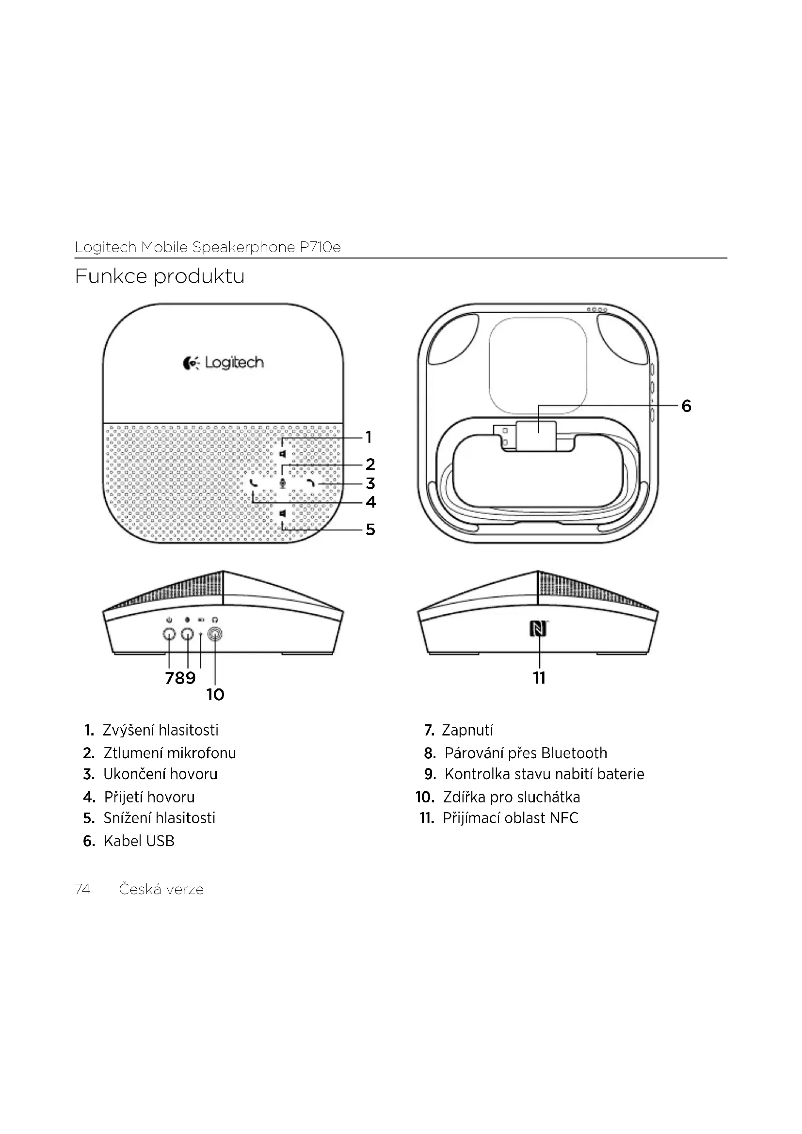2Logitech Mobile Speakerphone P710e Česká verze 75 Tlačítko napájení Tímto tlačítkem zapnete nebo vypnete přístroj P710e Tlačítko pro párování přes Bluetooth Stiskněte a podržte, dokud se na horní straně zařízení nerozsvítí indikátory modře v kruhu ve směru hodinových ručiček - zařízení P710e tak přepnete do režimu párování Indikátor stavu nabití baterie Při plném dobití se rozsvítí zeleně; pokud zbývá 30 minut životnosti baterie, rozsvítí se červeně; při dobíjení bliká červeně Tlačítko přijetí hovoru Stisknutím přijímáte hovory Tlačítko ukončení/ odmítnutí hovoru Stiskněte toto tlačítko pro ukončení nebo odmítnutí příchozího hovoru Tlačítko zvýšení hlasitosti Stiskněte toto tlačítko pro zvýšení hlasitosti reproduktoru Tlačítko snížení hlasitosti Stiskněte toto tlačítko pro snížení hlasitosti reproduktoru Tlačítko ztlumení mikrofonu Stisknutím ztlumíte nebo zrušíte ztlumení mikrofonu Přijímací oblast NFC Pro spárování nebo připojení/odpojení mobilního telefonu přiložte NFC anténu svého mobilního telefonu do blízkosti přijímací oblasti. Před prvním použitím přístroje P710e doporučujeme jeho nabití. Nabíjet můžete buď připojením k portu USB na počítači, nebo k libovolnému adaptéru USB AC.Logitech Mobile Speakerphone P710e 76 Česká verze Vkládací nástavce/posuvný vrchní kryt Horní část zařízení P710e lze odsunout – nachází se zde stojánek pro mobilní zařízení. Tento stojánek se hodí zejména v situacích, kdy potřebujete mobilní zařízení použít pro videokonference, čímž zajistíte vyšší stabilitu obrazu pro ostatní účastníky hovoru. K dispozici máte také nástavec, pomocí kterého můžete stojánek přizpůsobit velikosti vašeho mobilního zařízení. Nástavec lze vložit dvěma způsoby – viz obr. Přibližná velikost mobilního zařízení, které je možné vložit do stojánku, je: Strana 2: 0 mm až 8,5 mm Strana 1: 8,5 mm až 10,5mmLogitech Mobile Speakerphone P710e Česká verze 77 Úvodní nastavení zařízení