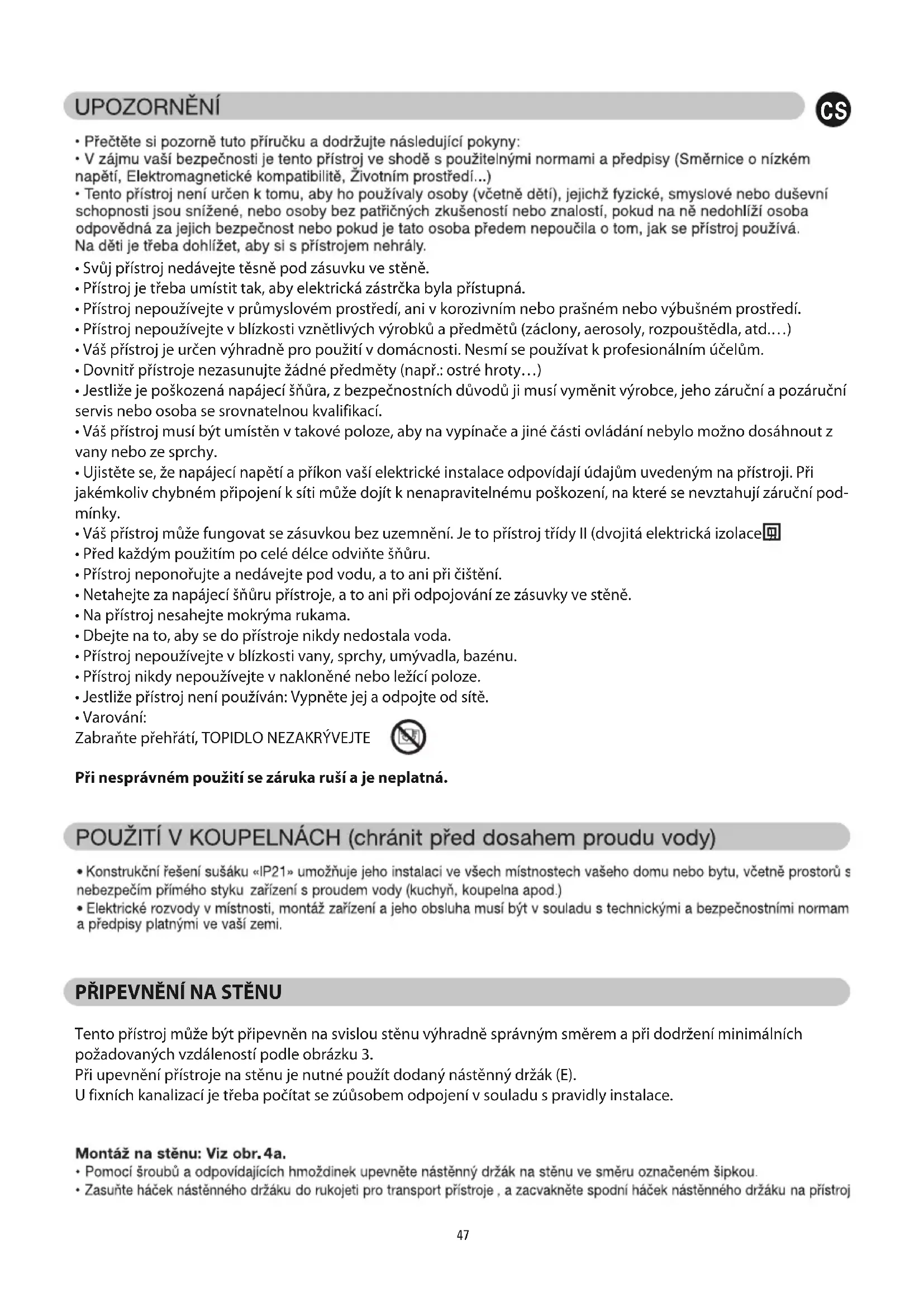 - Váš přístroj musí být umístěn v takové poloze, aby na vypínače a jiné části ovládání nebylo možno dosáhnout z vany nebo ze sprchy.