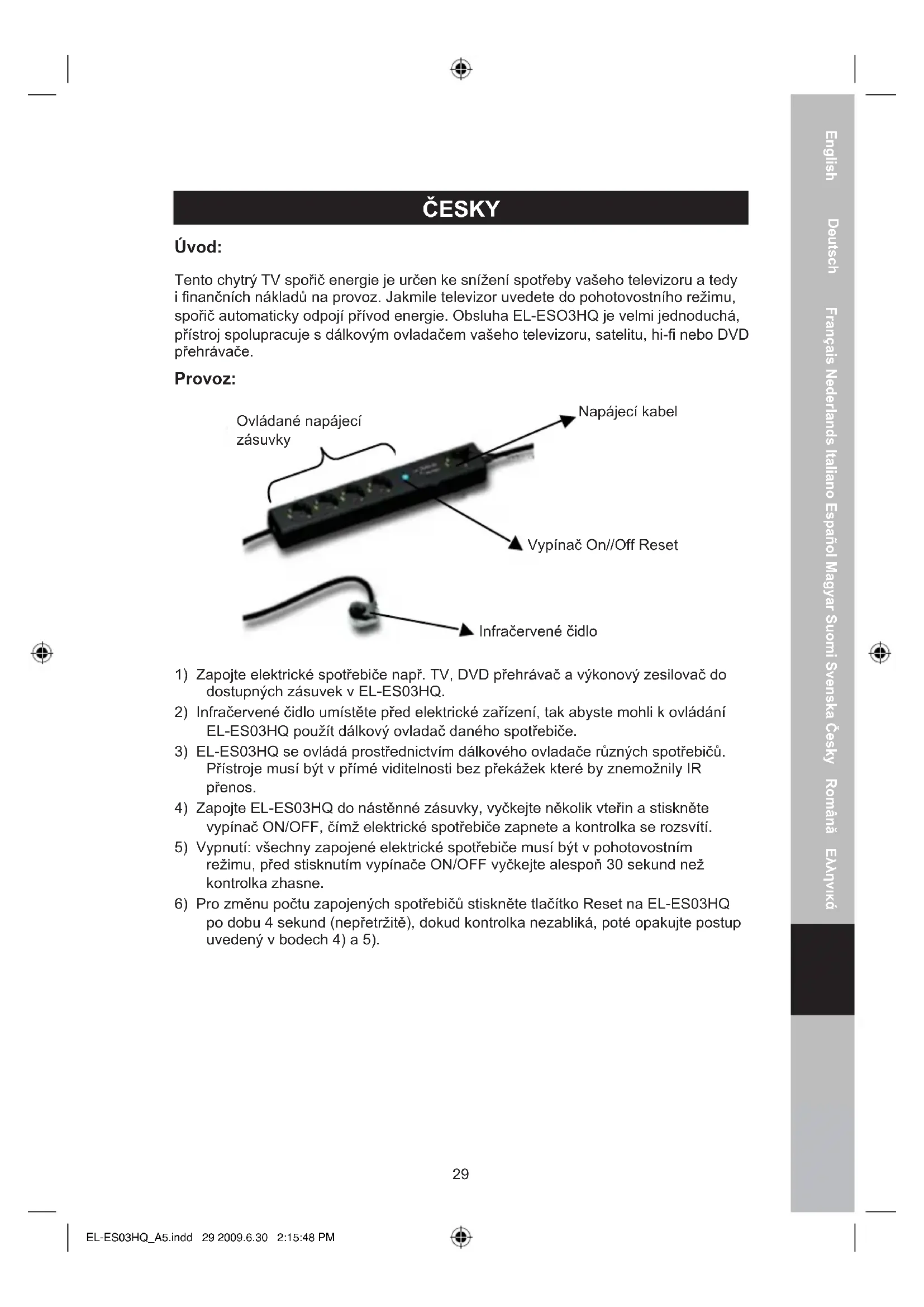Bezpečnostní opatření: NEBEZPEČÍ ÚRAZU ELEKTRICKÝM PROUDEMÖPPNA INTE UPOZORNĚNÍ Při použití chytrého spořiče energie pro TV vždy dodržujte bezpečnostní opatření, aby se tím snížilo riziko požáru, úrazu elektrickým proudem, a to následovně: Před použitím si pečlivě přečtěte celý návod k použití tohoto přístroje. Aby se snížilo riziko úrazu elektrickým proudem měl by tento výrobek v případě potřeby otevřít POUZE autorizovaný technik. Pokud došlo k problému, odpojte zařízení od elektrické sítě a ostatních přístrojů. Výrobek nevystavujte vodě nebo vlhkosti. Tento přístroj lze použít pouze v typu napájecího zdroje uvedeného na etiketě. Jestliže si nejste jistí tím typem napájecího zdroje, který máte doma, obraťte se pro další informace na vašeho prodejce. Nepřetěžujte zásuvku, vzniká tak riziko požáru nebo úrazu elektrickým proudem. Do tohoto přístroje nikdy nezasunujte cizí předměty, neboť by se mohly dotknout nebezpečného vysokého napětí nebo zařízení zkratovat a to by mohlo vest k nebezpečí vzniku požáru nebo úrazu elektrickým proudem. Údržba: K čištění používejte pouze suchý hadřík. Nepoužívejte čisticí rozpouštědla ani abrazivní prostředky. Záruka: Jakékoli změny, modikace nebo poškození zařízení v důsledku nesprávného zacházení se zařízením ruší platnost záruční smlouvy. Obecné upozornění: Design a specikace výrobku mohou být změněny bez předchozího upozornění. Všechna loga a obchodní názvy jsou registrované obchodní značky příslušných vlastníků a jsou chráněny zákonem. Tento návod uchovejte pro budoucí použití. Upozornění: Tento výrobek je označen tímto symbolem. To znamená, že se s výrobkem musí zacházet jako s nebezpečným elektrickým a elektronickým odpadem a nelze jej po skončení životnosti vyhazovat s běžným domácím odpadem. Pro lidkvidaci těchto výrobků existují zvláštní sběrná střediska. Copyright © EL-ES03HQ_A5.indd 31 2009.6.30 2:15:48 PMEnglish Deutsch FrançaisNederlandsItalianoEspañolMagyarSuomiSvenskaČeskyRomânăΕλληνικά