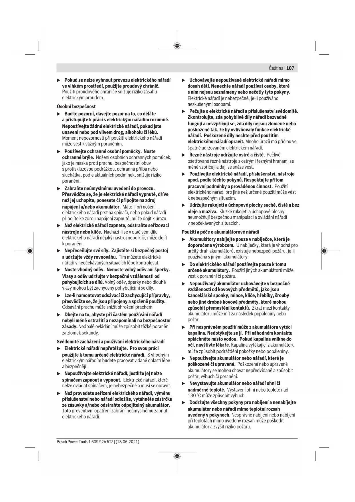 15,5 1,5 Úroveň vibrací aúroveň hluku, které jsou uvedené vtěchto pokynech, byly změřeny pomocí normované měřicí metody alze je použít pro vzájemné porovnání elektronářadí. Hodí se ipro předběžný odhad zatížení vibracemi ahlukem. Uvedená úroveň vibrací aúroveň hluku reprezentuje hlavní použití elektronářadí. Pokud se ovšem bude elektronářadí používat pro jiné práce, sjinými nástroji nebo snedostatečnou údržbou, může se úroveň hluku aúroveň vibrací lišit. To může zatížení vibracemi ahlukem po celou pracovní dobu zřetelně zvýšit. Pro přesný odhad zatížení vibracemi ahlukem by měly být zohledněny idoby, kdy je nářadí vypnuté nebo běží, ale ve skutečnosti se nepoužívá. To může zatížení vibracemi ahlukem po celou pracovní dobu výrazně snížit. Stanovte dodatečná bezpečnostní opatření kochraně obsluhy před účinky vibrací, jako je např. údržba elektronářadí anástrojů, udržování teplých rukou, organizace pracovních procesů. Montáž u Před každou prací na elektronářadí (např. údržba, výměna nástrojů) apři jeho přepravě auskladnění vyjměte akumulátor. Při neúmyslném stisknutí vypínače hrozí nebezpečí poranění. Nabíjení akumulátoru u Používejte pouze nabíječky uvedené vtechnických údajích. Jen tyto nabíječky jsou přizpůsobené pro lithium-iontový akumulátor používaný svaším elektronářadím. Upozornění: Akumulátor se dodává částečně nabitý. Aby byl zaručen plný výkon akumulátoru, před prvním použitím akumulátor úplně nabijte vnabíječce. Lithium-iontový akumulátor lze nabíjet kdykoli, aniž by se tím zkrátila životnost. Přerušení procesu nabíjení nepoškozuje akumulátor. Lithium-iontový akumulátor je díky „Electronic Cell Protection (ECP)“ chráněný proti hlubokému vybití. Při vybitém akumulátoru ochranná funkce vypne elektrické nářadí: Nástroj se již nepohybuje. u Po automatickém vypnutí elektronářadí už nestiskávejte vypínač. Akumulátor se může poškodit. Vyjmutí akumulátoru Akumulátor (12) je opatřený dvěma stupni zajištění, které mají zabránit vypadnutí akumulátoru při neúmyslném stisknutí odjišťovacího tlačítka (13). Pokud je akumulátor nasazený do elektronářadí, je držen ve své poloze pružinou. Pro vyjmutí akumulátoru (12) stiskněte odjišťovací tlačítko (13) aakumulátor vytáhněte zelektronářadí. Nepoužívejte přitom násilí. Ukazatel stavu nabití akumulátoru Zelené LED ukazatele stavu nabití akumulátoru indikují stav nabití akumulátoru. Zbezpečnostních důvodů je zjištění stavu nabití možné pouze při vypnutém elektronářadí. Pro zobrazení stavu nabití stiskněte tlačítko ukazatele stavu nabití nebo . Je to možné také při vyjmutém akumulátoru. Pokud po stisknutí tlačítka ukazatele stavu nabití nesvítí žádná LED, je akumulátor vadný amusí se vyměnit. Typ akumulátoru GBA 18V... LED Kapacita Trvale svítí tři zelené 60−100% Trvale svítí dvě zelené 30−60% Trvale svítí jedna zelená 5−30% Bliká jedna zelená 0−5% Typ akumulátoru ProCORE18V... LED Kapacita Trvale svítí pět zelených 80−100 % Trvale svítí čtyři zelené 60−80 % Trvale svítí tři zelené 40−60 % Trvale svítí dvě zelené 20−40 % Trvale svítí jedna zelená 5−20 % Bliká jedna zelená 0−5 % Přídavná rukojeť u Elektrické nářadí používejte pouze spřídavnou rukojetí (4). u Před každou prací se přesvědčte, že je přídavná rukojeť pevně utažená. Ztráta kontroly může způsobit poranění. Dbejte na to, aby byla přídavná rukojeť utažená utahovacím momentem, který je vhodný pro příslušnou metodu upevnění, aupevněte ji na elektrické nářadí tak, 1 609 92A 5TZ | (18.06.2021) Bosch Power ToolsČeština | 111 aby byl vyloučený jakýkoli pohyb přídavné rukojeti okolo nebo podél osy vrtání. Montáž přídavné rukojeti Pro povolení přídavné rukojeti otočte spodní část přídavné rukojeti (4) proti směru hodinových ručiček. Zatáhněte spojovací díl přídavné rukojeti (5) zpět adržte ho vtéto poloze. Pro připevnění přídavné rukojeti kelektronářadí nasaďte přídavnou rukojeť přes sklíčidlo. Poté pusťte spojovací díl (5). Poté znovu utáhněte dolní část přídavné rukojeti (4) po směru hodinových ručiček. Natočení přídavné rukojeti Přídavnou rukojeť(4) můžete libovolně natočit, abyste dosáhli bezpečného pracovního postoje bez únavy. Otočte dolní část přídavné rukojeti (4) proti směru hodinových ručiček anatočte přídavnou rukojeť (4) do požadované polohy. Poté znovu utáhněte dolní část přídavné rukojeti (4) po směru hodinových ručiček. Nastavení hloubky vrtání Pomocí hloubkového dorazu (3) lze nastavit požadovanou hloubku vrtáníX. Povolte křídlový šroub pro nastavení hloubkového dorazu (6) anasaďte hloubkový doraz do přídavné rukojeti (4). Hloubkový doraz (3) vytáhněte natolik, aby vzdálenost mezi špičkou vrtáku ašpičkou hloubkového dorazu (3) odpovídala požadované hloubce vrtáníX. Znovu utáhněte křídlový šroub pro nastavení hloubkového dorazu (6). Výměna nástroje (viz obrázek A) u Před každou prací na elektronářadí (např. údržba, výměna nástrojů) apři jeho přepravě auskladnění vyjměte akumulátor. Při neúmyslném stisknutí vypínače hrozí nebezpečí poranění. Otevřete rychloupínací sklíčidlo (2) otáčením ve směru➊ tak, aby bylo možné nasadit nástroj. Nasaďte nástroj. Rukou silně utáhněte objímku rychloupínacího sklíčidla (2) ve směru➋. Sklíčidlo se tím automaticky zajistí. Odsávání prachu/třísek Prach zmateriálů, jako jsou nátěry sobsahem olova, některé druhy dřeva, minerály akov, může být zdraví škodliv