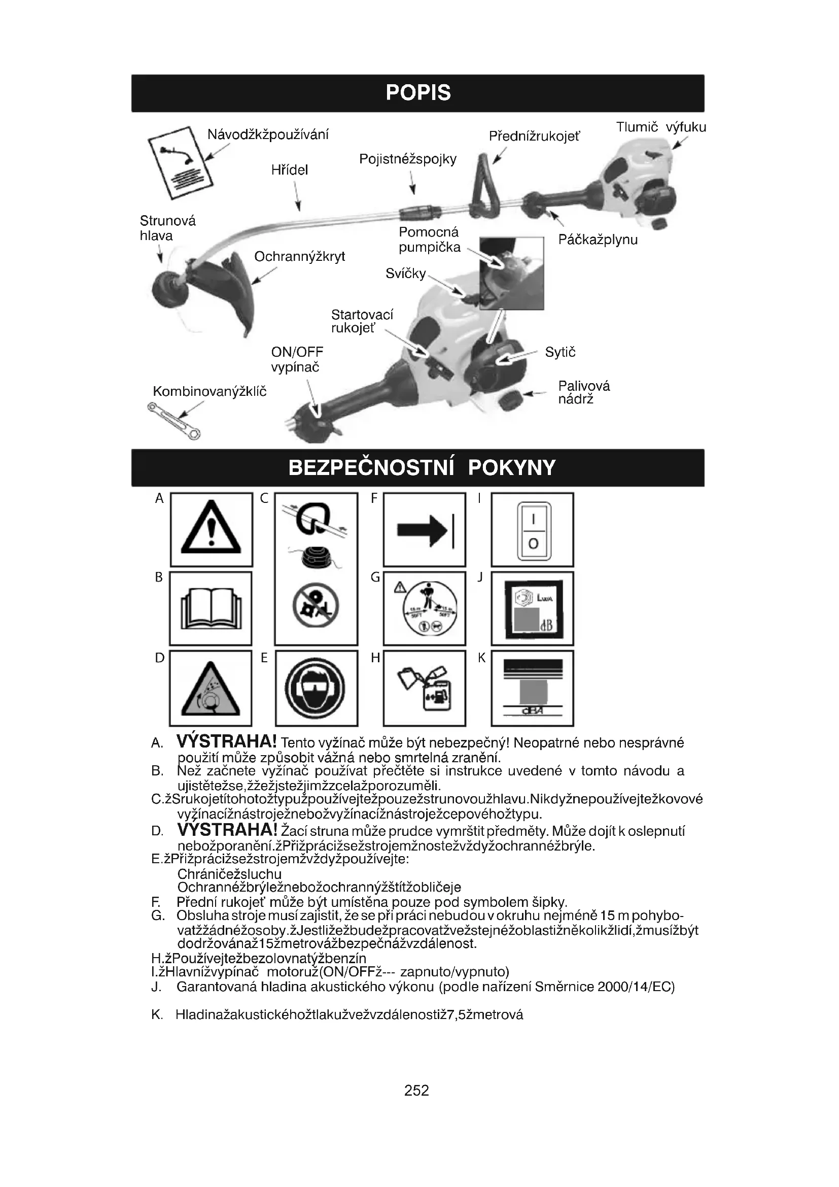 4&-<POPIS Pojistné spojky Návod k pou ívání TlumiŻ výfuku Strunová hlava SytiŻ Kombinovaný klíŻ ON/OFF vypínaŻ Startovací rukojeŭ Pomocná pumpiŻka PáŻka plynu PƗední rukojeŭ Palivová nádr HƗídel SvíŻky Ochranný kryt BEZPEżNOSTNÍ POKYNY A. VÝSTRAHA! Tento vy ínaŻ mÞ e být nebezpeŻný! Neopatrné nebo nesprávné pou ití mÞ e zpÞsobit vá ná nebo smrtelná zran÷ní. B. Ne zaŻnete vy ínaŻ pou ívat pƗeŻt÷te si instrukce uvedené v tomto návodu a ujist÷te se, e jste jim zcela porozum÷li. C. Srukojetítohoto typu pou ívejte pouze strunovou hlavu.Nikdy nepou ívejte kovové vy ínací nástroje nebo vy ínací nástroje cepového typu.