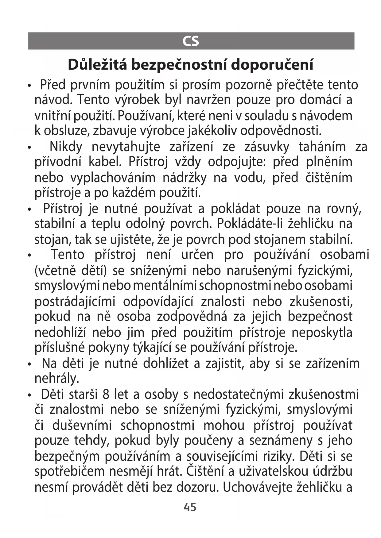 - Děti starši 8 let a osoby s nedostatečnými zkušenostmi či znalostmi nebo se sníženými fyzickými, smyslovými či duševními schopnostmi mohou přístroj používat pouze tehdy, pokud byly poučeny a seznámeny s jeho bezpečným používáním a souvisejícími riziky. Děti si se spotřebičem nesmějí hrát. Čištění a uživatelskou údržbu nesmí provádět děti bez dozoru. Uchovávejte žehličku a 45její kabel mimo dosah dětí mladších 8 let, pokud je pod napětím nebo se ochlazuje
