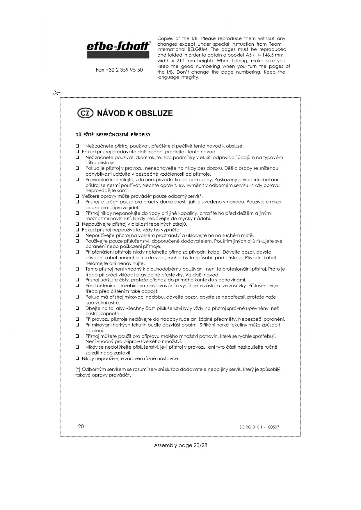 Fax +32 2 359 95 50 DOBA PROVOZU Tento přístroj není vhodný pro dlouhodobý provoz. Je třeba při práci dělat přestávky. Pokud nebudete brát toto upozornění na vědomí, přístroj se poškodí. Maximální doba provozu je při šlehání a hnětení 5 minut, při mixování 1 minuta. MONTÁŽ