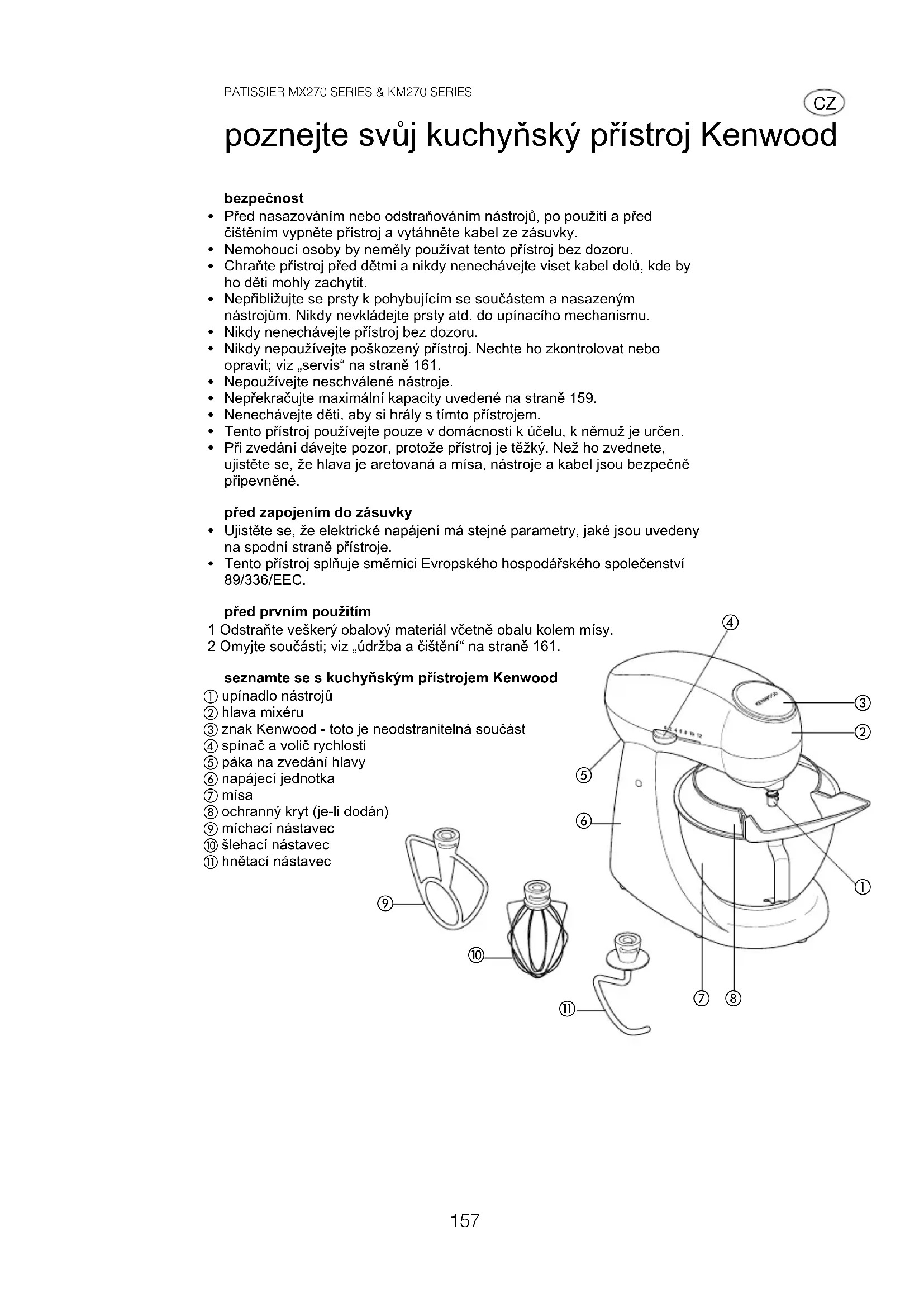 Tento přístroj splňuje směrnici Evropského hospodářského společenství 89/336/EEC. před prvním použitím 1 Odstraňte veškerý obalový materiál včetně obalu kolem mísy. 2 Omyjte součásti; viz „údržba a čištění“ na straně 161. seznamte se s kuchyňským přístrojem Kenwood upínadlo nástrojů hlava mixéru znak Kenwood - toto je neodstranitelná součást spínač a volič rychlosti páka na zvedání hlavy napájecí jednotka mísa ochranný kryt (je-li dodán) míchací nástavec šlehací nástavec hnětací nástavec