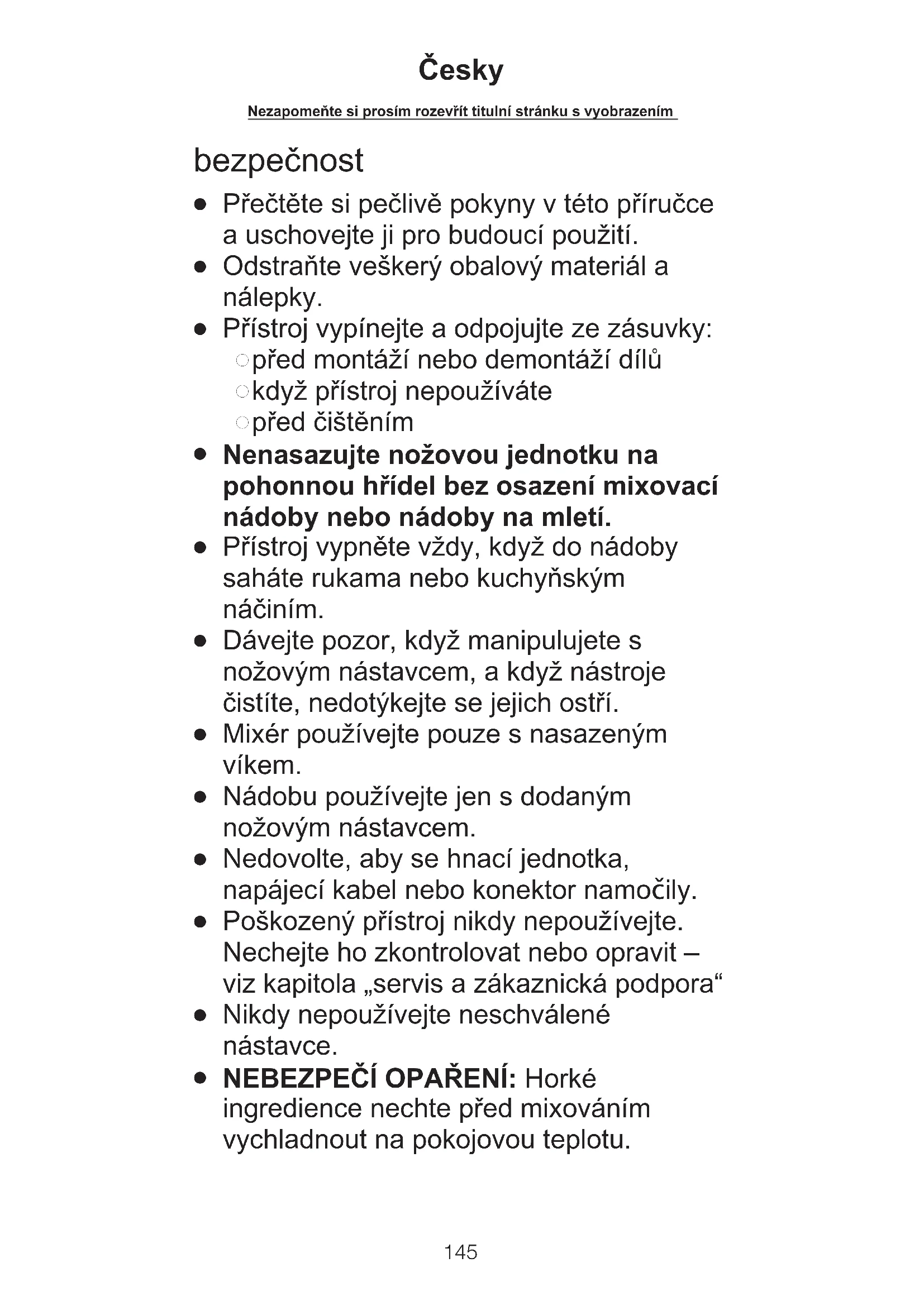 Ïesky Nezapomeñte si prosím rozev¡ít titulní stránku s vyobrazenímG Přístroj v chodu nenechávejte nikdy bez dozoru.