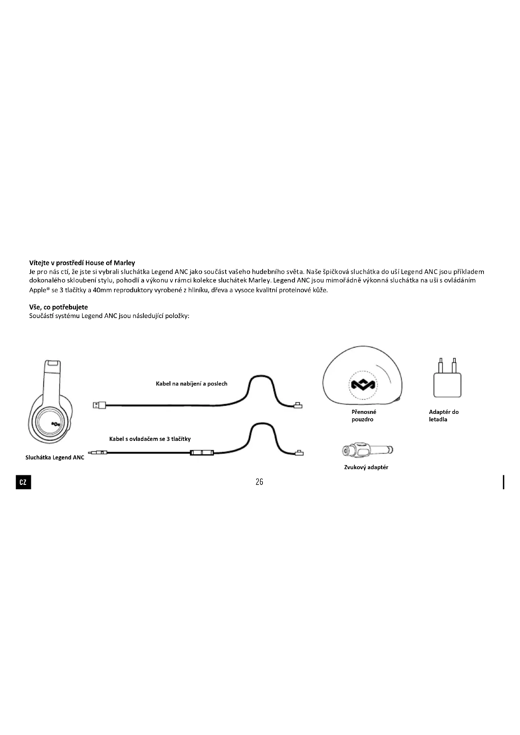 Vítejte v prostředí House of Marley Je pro nás c, že jste si vybrali sluchátka Legend ANC jako součást vašeho hudebního světa. Naše špičková sluchátka do uší Legend ANC jsou příkladem dokonalého skloubení stylu, pohodlí a výkonu v rámci kolekce sluchátek Marley. Legend ANC jsou mimořádně výkonná sluchátka na uši s ovládáním Apple® se 3 tlačítky a 40mm reproduktory vyrobené z hliníku, dřeva a vysoce kvalitní proteinové kůže. Vše, co potřebujete Součás systému Legend ANC jsou následující položky: Sluchátka Legend ANC Kabel s ovladačem se 3 tlačítky Kabel na nabíjení a poslech Přenosné pouzdro Zvukový adaptér Adaptér do letadla27 Užijte si sluchátka značky Legend ANC Sluchátka Legend ANC lze používat se zapnutou („ON“) a vypnutou („OFF“) funkcí ANC. Pokud chcete zapnout („ON“) funkci akvního rušení hluku, posuňte vypínač umístěný na pravém sluchátku směrem nahoru. Rozsví se kontrolka, která signalizuje, že funkce ANC je akvní. Technologie ve sluchátkách Legend ANC akvně potlačí nežádoucí vnější hluk a zároveň zajis takovou míru detailu a výkonu, jakou si vaše hudba zaslouží. V průběhu sekvence „ON“ (Zap.) se rozsví kontrolka LED baterie za účelem zobrazení úrovně nabi baterie. Nabíjení zařízení Při nabíjení sluchátek Legend ANC použijte dodaný nabíjecí kabel nebo jiný standardní kabel Micro-USB. Systém Legend ANC můžete napájet prostřednictvím portu USB v počítači nebo pomocí nabíjecího adaptéru USB. Výměna baterie Systém Legend ANC obsahuje nabíjecí baterii, která by měla být funkční po celou dobu životnos produktu. Pokud by však bylo třeba baterii vyměnit, kontaktujte zákaznickou službu, která vám poskytne podrobné informace o záruční a mimozáruční výměně baterie. Kompabilita mikrofonu a ovladače se třemi tlačítky Integrovaný mikrofon umožňuje volný pohyb rukou. Ssknum tlačítka převezmete hovor a opětovným ssknum jej ukončíte. Funkce přecházení mezi stopami, přehrávání a přerušení přehrávání zobrazené na obrázku lze používat pouze se zařízeními značky Apple. x1 x1