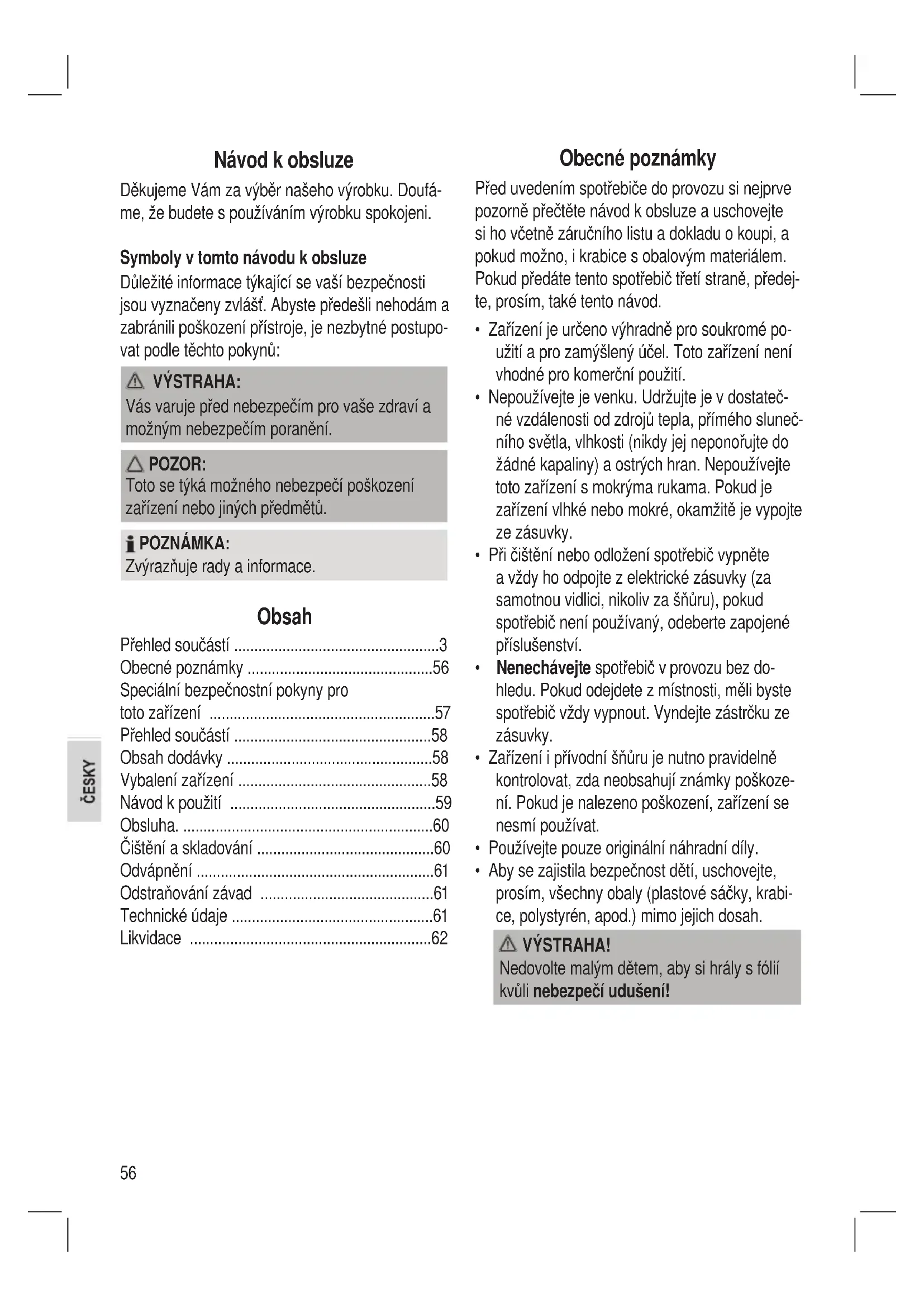 - Aby se zajistila bezpečnost dětí, uschovejte, prosím, všechny obaly (plastové sáčky, krabi- ce, polystyrén, apod.) mimo jejich dosah. VÝSTRAHA! Nedovolte malým dětem, aby si hrály s fólií kvůli nebezpečí udušení!57 Speciální bezpečnostní pokyny pro toto zařízení Na výrobku najdete následující ikonu s výstrahou nebo upozorněním: VÝSTRAHA: Nebezpečí popálení! Během provozu a následně po něm mají přístupné povrchy velmi vysokou teplotu.