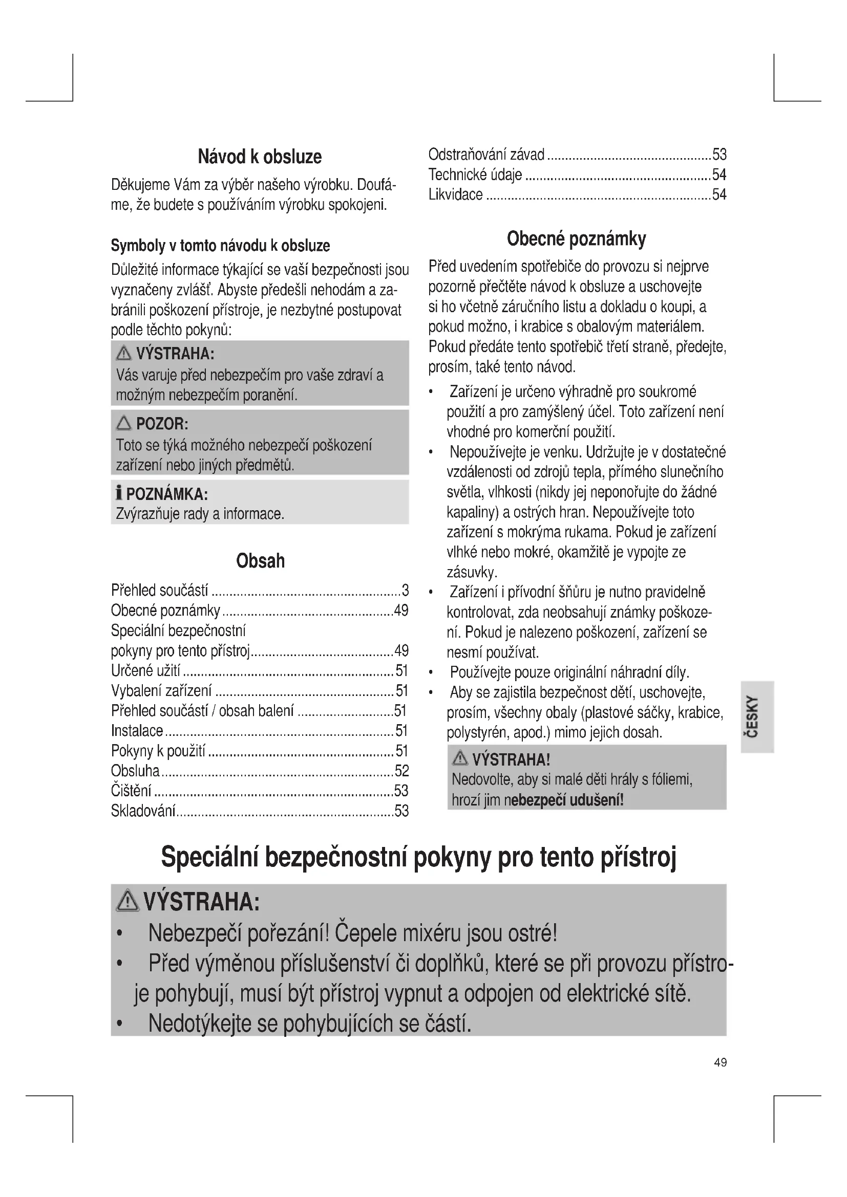 - Abysezajistilabezpečnostdětí,uschovejte, prosím,všechnyobaly(plastovésáčky,krabice, polystyrén,apod.)mimojejichdosah. VÝSTRAHA! Nedovolte,abysimalédětihrálysfóliemi, hrozí jim nebezpečí udušení! Speciální bezpečnostní pokyny pro tento přístroj VÝSTRAHA: