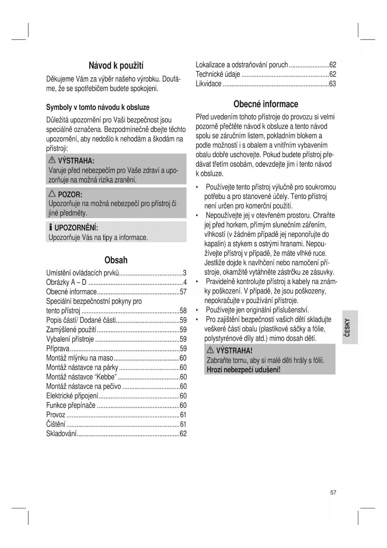- Prozajištěníbezpečnostivašichdětískladujte veškeréčástiobalu(plastikovésáčkyafólie, polystyrénovédílyatd.)mimodosahdětí. VÝSTRAHA! Zabraňtetomu,abysimalédětihrálysfólií. Hrozí nebezpečí udušení!58 Speciální bezpečnostní pokyny pro tento přístroj VÝSTRAHA: Nebezpečí zranění!