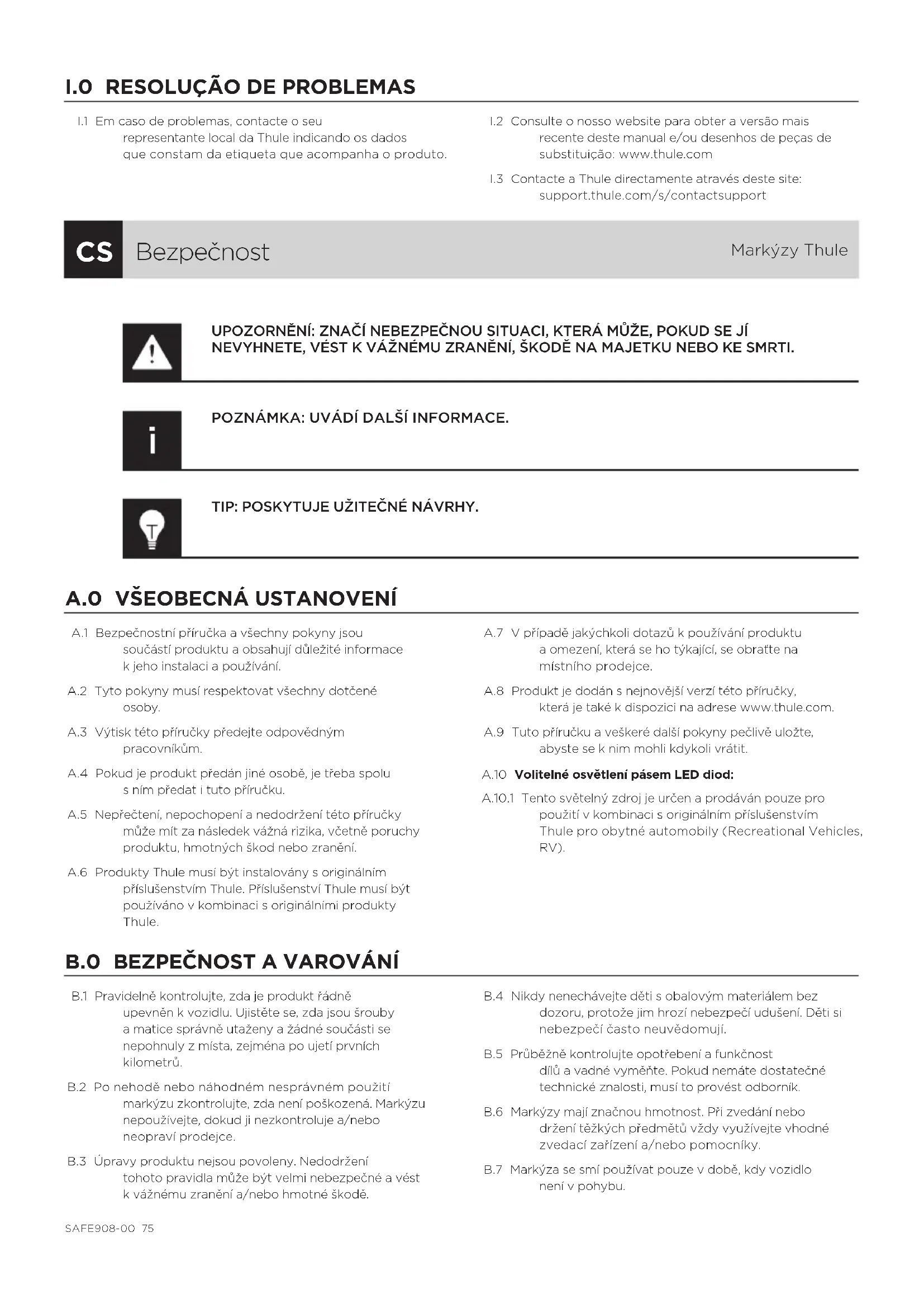 A.1 Bezpečnostní příručka avšechny pokyny jsou součástí produktu aobsahují důležité informace kjeho instalaci apoužívání. A.2 Tyto pokyny musí respektovat všechny dotčené osoby.A.3 Výtisk této příručky předejte odpovědným pracovníkům.A.4 Pokud je produkt předán jiné osobě, je třeba spolu sním předat ituto příručku.A.5 Nepřečtení, nepochopení anedodržení této příručky může mít za následek vážná rizika, včetně poruchy produktu, hmotných škod nebo zranění.A.6 Produkty Thule musí být instalovány soriginálním příslušenstvím Thule. Příslušenství Thule musí být používáno vkombinaci soriginálními produkty Thule.A.7 Vpřípadě jakýchkoli dotazů kpoužívání produktu aomezení, která se ho týkající, se obraťte na místního prodejce.A.8 Produkt je dodán snejnovější verzí této příručky, která je také kdispozici na adrese www.thule.com.A.9 Tuto příručku aveškeré další pokyny pečlivě uložte, abyste se knim mohli kdykoli vrátit.A.10 Volitelné osvětlení pásem LED diod:A.10.1 Tento světelný zdroj je určen aprodáván pouze pro použití vkombinaci soriginálním příslušenstvím Thule pro obytné automobily (Recreational Vehicles, RV).