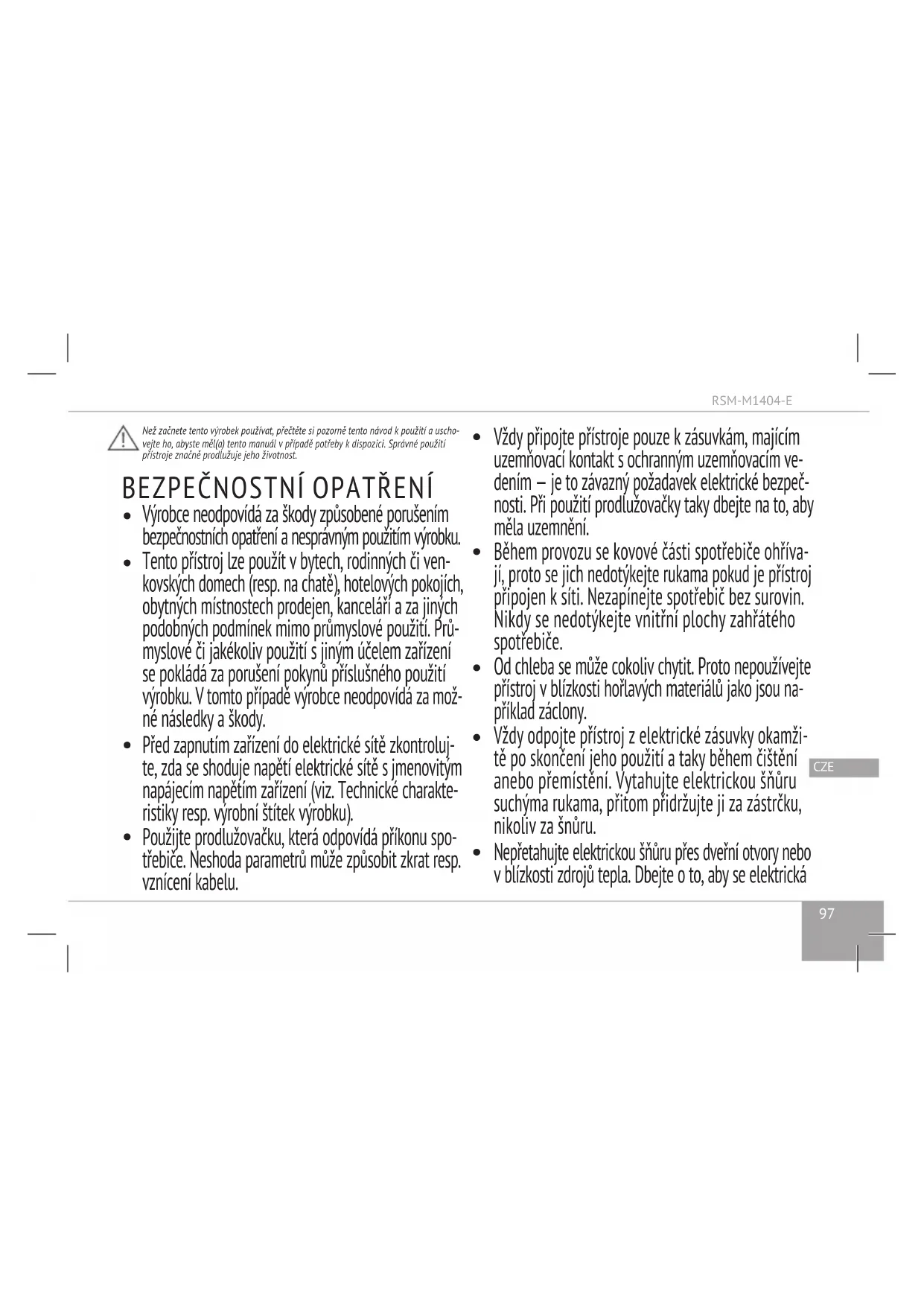 Na tento výrobek je stanovena záruční doba 2 roky od data prodeje spotřebiteli. Vprů- behu záruční doby se výrobce prostřednictvím opravy, výměny součástek resp. celého zařízení zavazuje odstranit všechny chyby, které jsou důsledkem nedostatečné kvality materiálů či montáže. Záruka je platná pouze vpřípadě, pokud je datum nákupu potvr- zen razítkem prodejny/obchodu a podpisem prodavače na originálním záručním listu. Tato záruka se uznává pouze vtom případě, bylo-li použito přístroje vsouladu snávo- dem k použití, přístroj nebyl opravován, rozebrán resp. poškozen vdůsledku nespráv- ného zacházení, a taky je-li uschována kompletní dokumentace a všechny součásti výrobku. Tato záruka se nevztahuje na přirozené opotřebení výrobku a jeho spotřební materiály (ltry, lampičky, nepřilnavé povrchy, těsnicí kroužky apod.). Doba použití zařízení a termín platnosti záručních závazků na toto zařízení počínají běžet dnem jeho prodeje resp. od data výroby zařízení (v případě, když se nedá stanovit přesně datum prodeje).RSM-M1404-E
