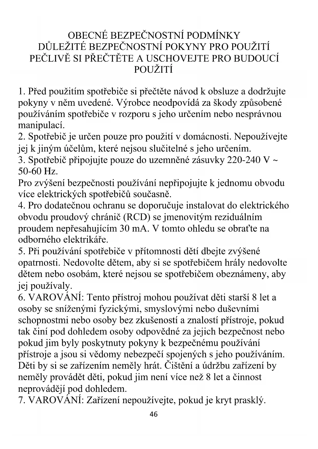 pokyny v něm uvedené. Výrobce neodpovídá za škody způsobené používáním spotřebiče v rozporu s jeho určením nebo nesprávnou manipulací.