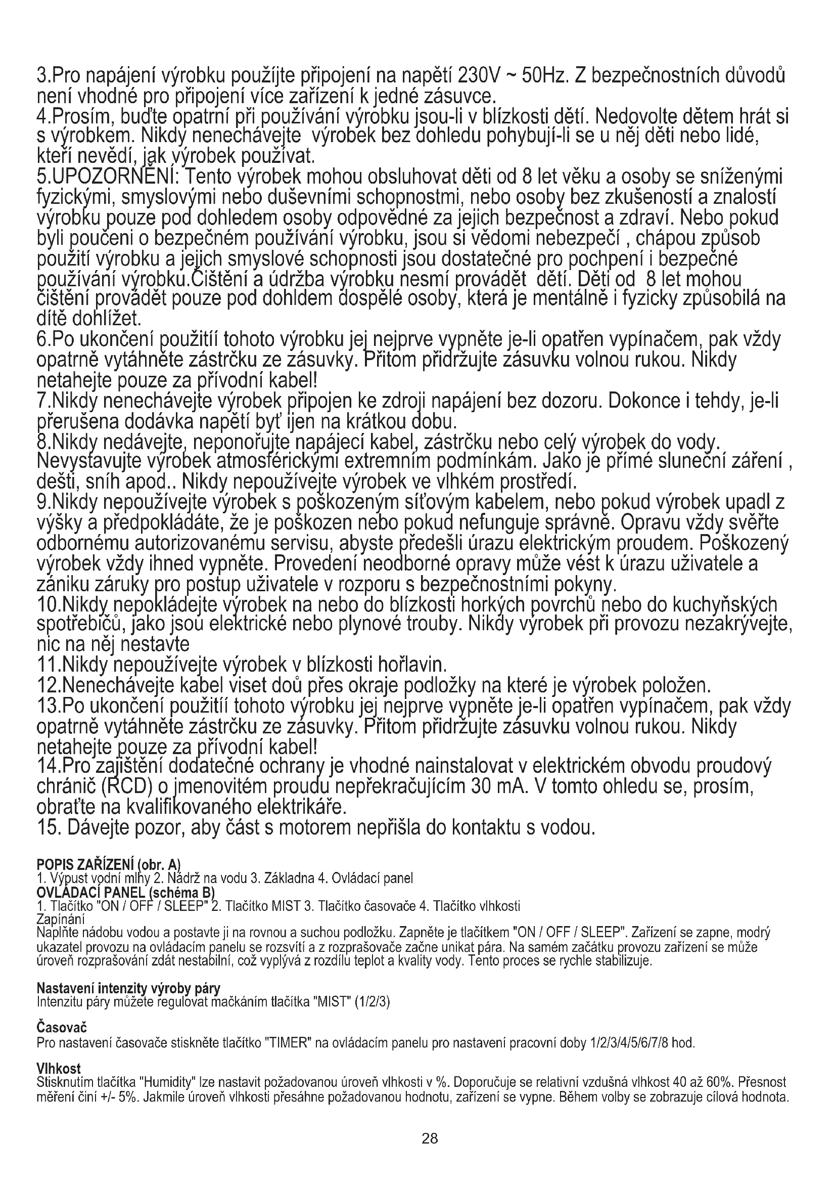 Για να ενεργοποιήσετε τη λειτουργία SLEEP, πιέστε το πλήκτρο «SLEEP» στο πάνελ ελέγχου 3-5 δευτερόλεπτα, έπειτα η οθόνη απενεργοποιείται πλήρως. Για να απενεργοποιήσετε τη λειτουργία αυτή πιέστε το πλήκτρο «SLEEP» στο πάνελ ελέγχου εκ νέου για 3-5 δευτερόλεπτα, έπειτα ο δείκτης της λειτουργίας SLEEP στην οθόνη σβήνει ενώ η οθόνη LED ανάβει. Αυτόματη απενεργοποίηση σε περίπτωση έλλειψης νερού Εάν το επίπεδο του νερού στο δοχείο πέσει κάτω από το ελάχιστο επιτρεπτό, η υπερηχητική μεμβράνη της συσκευής απενεργοποιείται αυτόματα και στο πάνελ ελέγχου ανάβει ο δείκτης έλλειψης νερού. Για να συνεχιστεί η λειτουργία της συσκευής είναι αναγκαίο να γεμίσετε το δοχείο με νερό. Γέμισμα δοχείου Πάντοτε αποσυνδέστε τη συσκευή από το ρεύμα πριν την αφαίρεση του δοχείου νερού. Μην αγγίζετε το νερό στη βάση κατά τη λειτουργία. ● Αφαιρέστε το δοχείο νερού από τη βάση και ξεβιδώστε το καπάκι από το δοχείο νερού. ● Βεβαιωθείτε ότι στο δοχείο δεν βρίσκονται ξένα αντικείμενα. ● Γεμίστε το δοχείο με καθαρό, κρύο νερό βρύσης. Κλείστε καλά το καπάκι του δοχείου νερού, τοποθετήστε το δοχείο νερού στη βάση. ● Μην χύνετε νερό στην έξοδο ατμού της συσκευής. ● Τοποθετήστε το φις στην πρίζα και ενεργοποιήστε τη συσκευή με τη βοήθεια του διακόπτη ενεργοποίησης / απενεργοποίησης. Χρήση πρόσθετων Μπορείτε να χρησιμοποιήσετε πρόσθετα για το νερό (αιθέρια έλαια, αρωματικές ουσίες). Καθαρισμός / συντήρηση Πάντοτε να αποσυνδέετε τη συσκευή από το ρεύμα πριν από την αφαίρεση του δοχείου νερού. Μην αγγίζετε το νερό στη βάση κατά τη λειτουργία! Προσοχή – κίνδυνος ηλεκτροπληξίας και βλάβης του προϊόντος! ● Πριν από τον καθαρισμό απενεργοποιήστε τη συσκευή και αποσυνδέστε την από την πρίζα. ● Καθαρίζετε τακτικά το δοχείο νερού και τη βάση. Χρησιμοποιείτε μόνο νερό χωρίς απορρυπαντικά. Φύλαξη της συσκευής για παρατεταμένο διάστημα Καθαρίστε τη συσκευή σύμφωνα με την παραπάνω περιγραφή και αφήστε την να στεγνώσει πλήρως. Φυλάξτε τη συσκευή κατά προτίμηση στην αυθεντική συσκευασία, σε ξηρό μέρος μακριά από υψηλές θερμοκρασίες. ΤΕΧΝΙΚΑ ΧΑΡΑΚΤΗΡΙΣΤΙΚΑ Τροφοδοσία: 220-240V~50Hz Ονομαστική ισχύς: 23 W Max. ισχύς: 25W NEDERLANDS ČESKY Προστασία του περιβάλλοντος Η χάρτινη συσκευασία παρακαλούμε να παραδοθεί για ανακύκλωση. Τις σακούλες από πολυαιθυλένιο να τις πετάτε σε κατάλληλα δοχεία. Τις παλιές συσκευές πρέπει να αποσύρετε με κατάλληλες διαδικασίες συγκέντρωσης αποβλήτων, διότι επικίνδυνα συστατικά της συσκευής BEZPEČNOSTNÍ PODMÍNKY. DŮLEŽITÉ POKYNY TÝKAJÍCÍ SE POUŽiTÍ A PROVOZU VÝROBKU. PODMÍNKY SI PROSÍM PŘEČTĚTE POZORNĚ A USCHOVEJTE JE PRO BUDOUCÍ POUŽITÍ. Záruční podmínky neplatí, pokud je přístroj použit pro komerční účely nebo v rozporu s nvodem. Přístroj je určen pouze pro použití v domácnosti. 1.Před použitím výrobku si pečlivě přečtěte návod a vždy postupujte v souladu s uvedenými pokyny. Výrobce ani distributor není odpovědný za případné škody vzniklé v důsledku neodborné manipulace nebo použití v rozporu s návodem. 2.Výrobek lze použít pouze v interiéru. Nepoužívejte tento výrobek pro jakýkoli účel, pro který není určen.28 3.Pro napájení výrobku použíjte připojení na napětí 230V ~ 50Hz. Z bezpečnostních důvodů není vhodné pro připojení více zařízení k jedné zásuvce. 4.Prosím, buďte opatrní při používání výrobku jsou-li v blízkosti dětí. Nedovolte dětem hrát si s výrobkem. Nikdy nenechávejte výrobek bez dohledu pohybují-li se u něj děti nebo lidé, kteří nevědí, jak výrobek používat. 5.UPOZORNĚNÍ: Tento výrobek mohou obsluhovat děti od 8 let věku a osoby se sníženými fyzickými, smyslovými nebo duševními schopnostmi, nebo osoby bez zkušeností a znalostí výrobku pouze pod dohledem osoby odpovědné za jejich bezpečnost a zdraví. Nebo pokud byli poučeni o bezpečném používání výrobku, jsou si vědomi nebezpečí , chápou způsob použití výrobku a jejich smyslové schopnosti jsou dostatečné pro pochpení i bezpečné používání výrobku.Čištění a údr