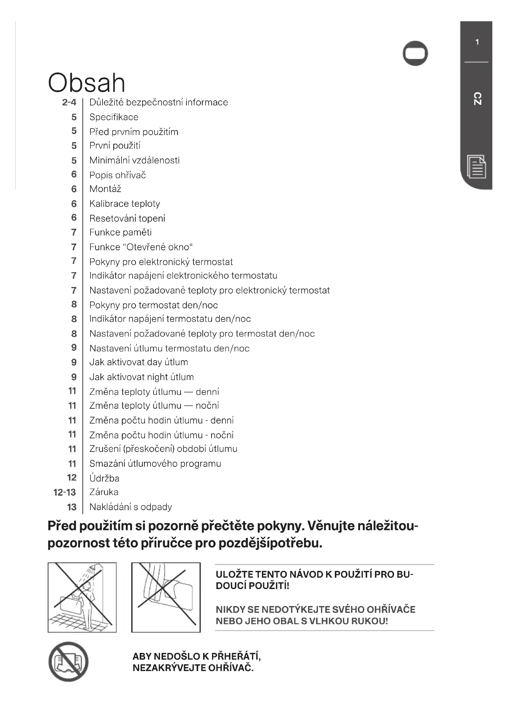 Důležité bezpečnostní informace Specifikace Před prvním použitím První použití Minimální vzdálenosti Popis ohřívač Montáž Kalibrace teploty Resetování topení Funkce paměti Funkce “Otevřené okno“ Pokyny pro elektronický termostat Indikátor napájení elektronického termostatu Nastavení požadované teploty pro elektronický termostat Pokyny pro termostat den/noc Indikátor napájení termostatu den/noc Nastavení požadované teploty pro termostat den/noc Nastavení útlumu termostatu den/noc Jak aktivovat day útlum Jak aktivovat night útlum Změna teploty útlumu — denní Změna teploty útlumu — noční Změna počtu hodin útlumu - denní Změna počtu hodin útlumu - noční Zrušení (přeskočení) období útlumu Smazání útlumového programu Údržba Záruka Nakládání s odpady Před použitím si pozorně přečtěte pokyny. Věnujte náležitou- pozornost této příručce pro pozdějšípotřebu. ULOŽTE TENTO NÁVOD K POUŽITÍ PRO BU DOUCÍ POUŽITÍ! NIKDY SE NEDOTÝKEJTE SVÉHO OHŘÍVAČE NEBO JEHO OBAL S VLHKOU RUKOU! ABY NEDOŠLO K PŘHEŘÁTÍ, NEZAKRÝVEJTE OHŘÍVAČ.2 millnorway.com