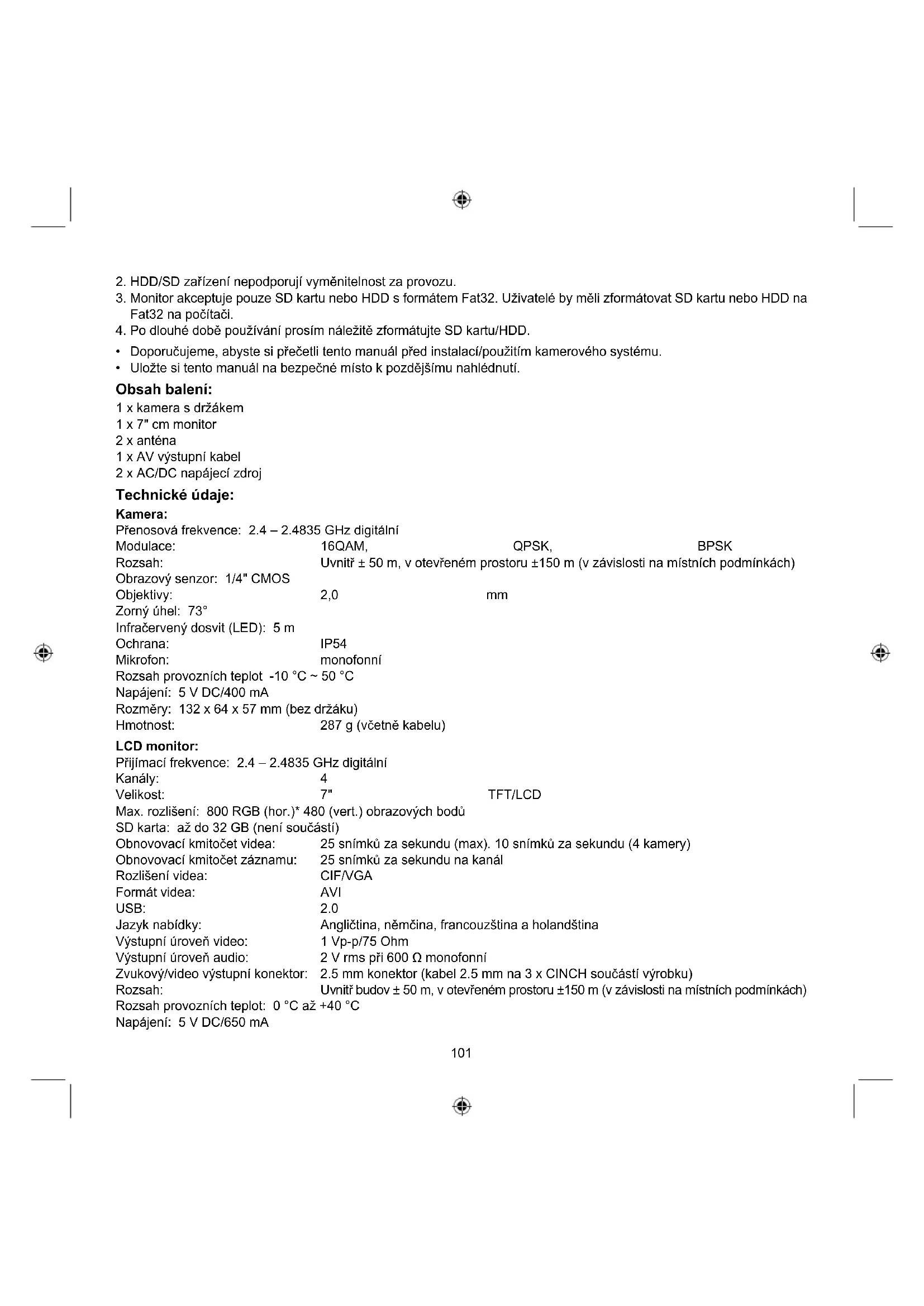 - Uložte si tento manuál na bezpečné místo k pozdějšímu nahlédnutí. Obsah balení: 1 x kamera s držákem 1 x 7" cm monitor 2 x anténa 1 x AV výstupní kabel 2 x AC/DC napájecí zdroj Technické údaje: Kamera: Přenosová frekvence: 2.4 – 2.4835 GHz digitální Modulace: 16QAM, QPSK, BPSK Rozsah: Uvnitř ± 50 m, v otevřeném prostoru ±150 m (v závislosti na místních podmínkách) Obrazový senzor: 1/4" CMOS Objektivy: 2,0 mm Zorný úhel: 73° Infračervený dosvit (LED): 5 m Ochrana: IP54 Mikrofon: monofonní Rozsah provozních teplot -10 °C ~ 50 °C Napájení: 5 V DC/400 mA Rozměry: 132 x 64 x 57 mm (bez držáku) Hmotnost: 287 g (včetně kabelu) LCD monitor: Přijímací frekvence: 2.4 – 2.4835 GHz digitální Kanály: 4 Velikost: 7" TFT/LCD Max. rozlišení: 800 RGB (hor.)* 480 (vert.) obrazových bodů SD karta: až do 32 GB (není součástí) Obnovovací kmitočet videa: 25 snímků za sekundu (max). 10 snímků za sekundu (4 kamery) Obnovovací kmitočet záznamu: 25 snímků za sekundu na kanál Rozlišení videa: CIF/VGA Formát videa: AVI USB: 2.0 Jazyk nabídky: Angličtina, němčina, francouzština a holandština Výstupní úroveň video: 1 Vp-p/75 Ohm Výstupní úroveň audio: 2 V rms při 600 Ω monofonní Zvukový/video výstupní konektor: 2.5 mm konektor (kabel 2.5 mm na 3 x CINCH součástí výrobku) Rozsah: Uvnitř budov ± 50 m, v otevřeném prostoru ±150 m (v závislosti na místních podmínkách) Rozsah provozních teplot: 0 °C až +40 °C Napájení: 5 V DC/650 mA102 Rozměry: 214 x 157 x 26 mm Hmotnost: 488 g Bezpečnostní opatření: