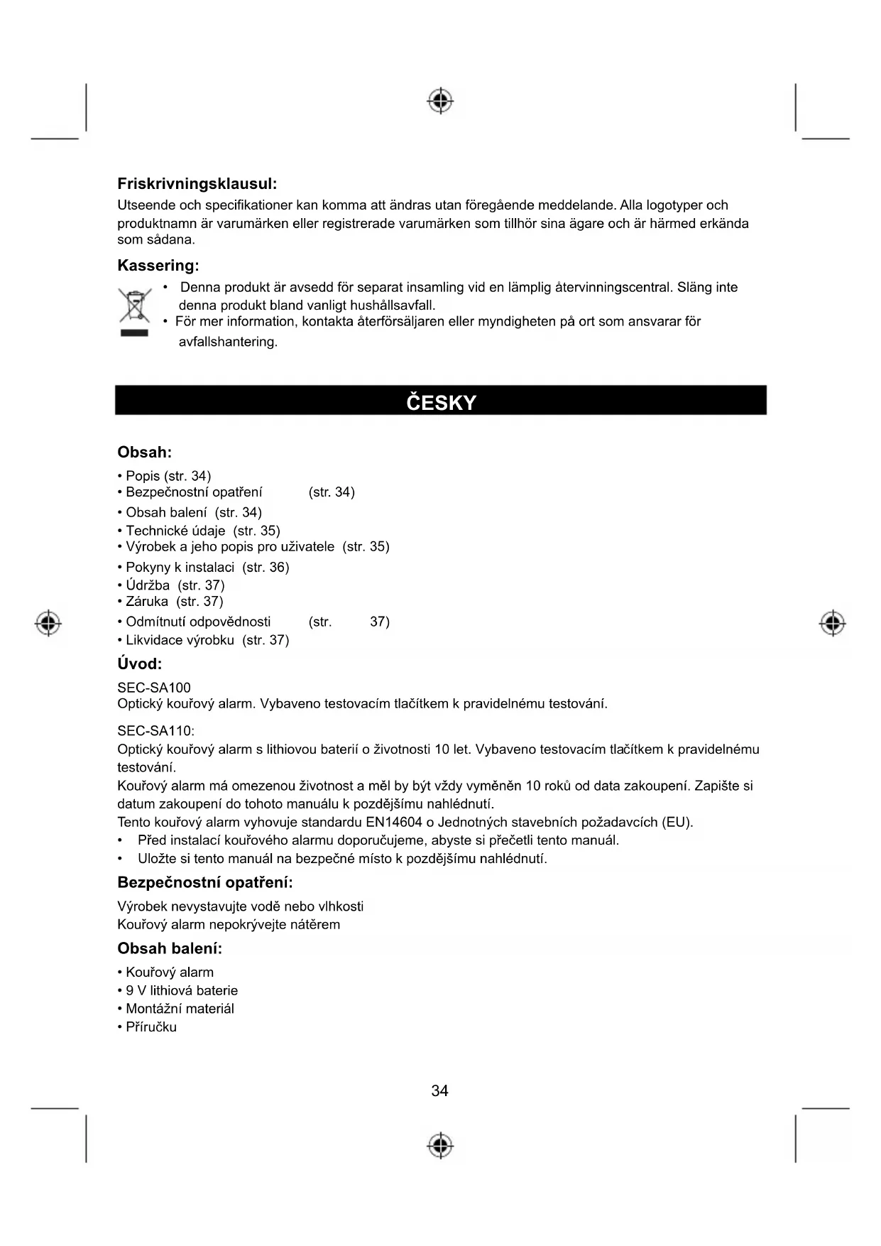 - Likvidace výrobku (str. 37) Úvod: SEC-SA100 Optický kouřový alarm. Vybaveno testovacím tlačítkem k pravidelnému testování. SEC-SA110: Optický kouřový alarm s lithiovou baterií o životnosti 10 let. Vybaveno testovacím tlačítkem k pravidelnému testování. Kouřový alarm má omezenou životnost a měl by být vždy vyměněn 10 roků od data zakoupení. Zapište si datum zakoupení do tohoto manuálu k pozdějšímu nahlédnutí. Tento kouřový alarm vyhovuje standardu EN14604 o Jednotných stavebních požadavcích (EU).