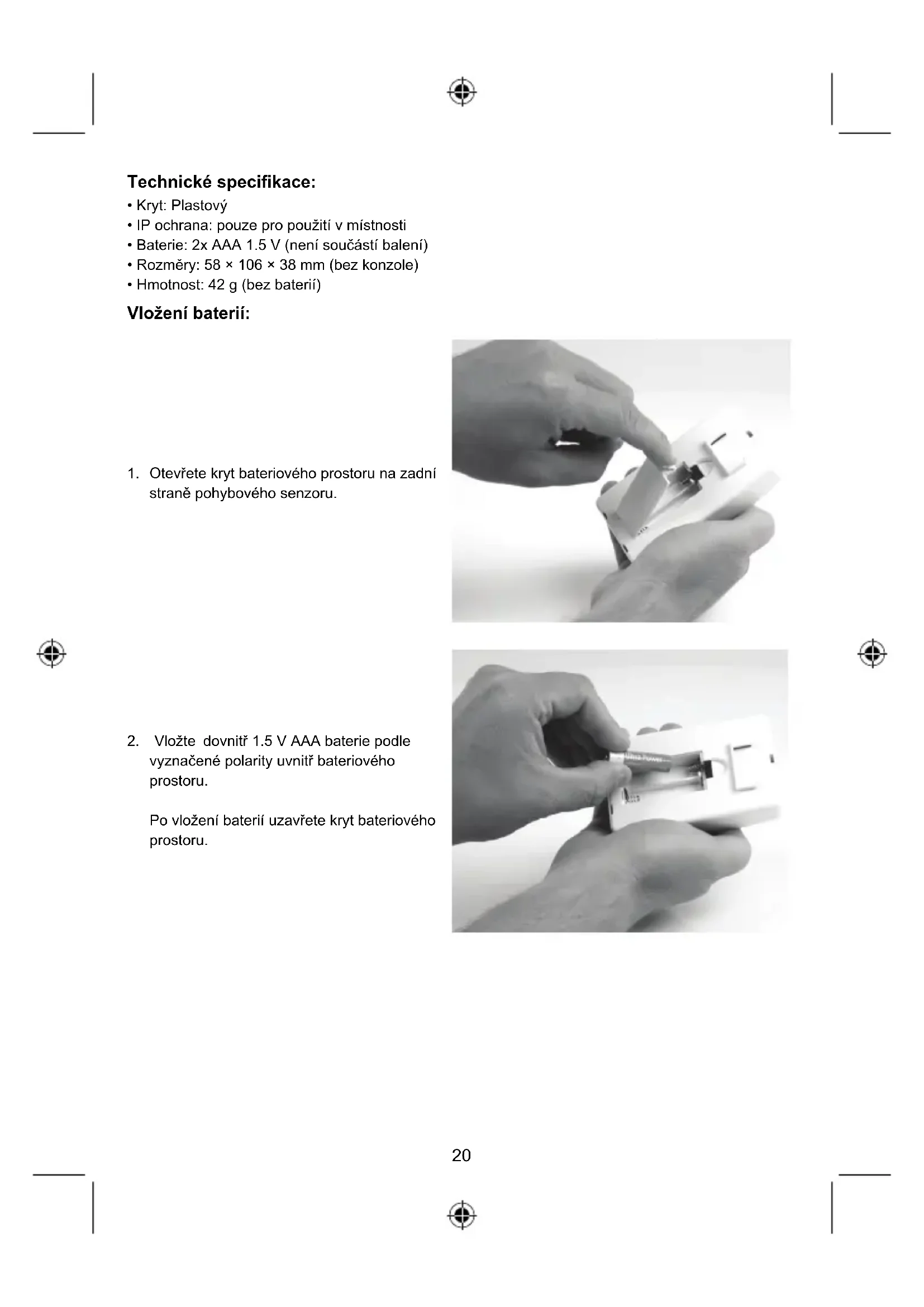 vyznačené polarity uvnitř bateriového prostoru. Po vložení baterií uzavřete kryt bateriového prostoru.21 Upevnění pohybového senzoru Pro snadné upevnění na zeď může být montážní konzola oddělena od pohybového senzoru. Bezpečnostní opatření: Výrobek nevystavujte vodě nebo vlhkosti. Údržba: Výrobek čistěte pouze suchým hadříkem. Nepoužívejte rozpouštědla ani abrazivní čisticí prostředky. Záruka: Při změnách a/nebo modifikacích výrobku záruka zaniká. Při nesprávném používání tohoto výrobku neneseme odpovědnost za vzniklé škody. Vyloučení zodpovědnosti: Design a specifikace výrobku mohou být změněny bez předchozího upozornění. Všechna loga a obchodní názvy jsou registrované obchodní značky příslušných vlastníků a jsou chráněny autorským právem. Likvidace: