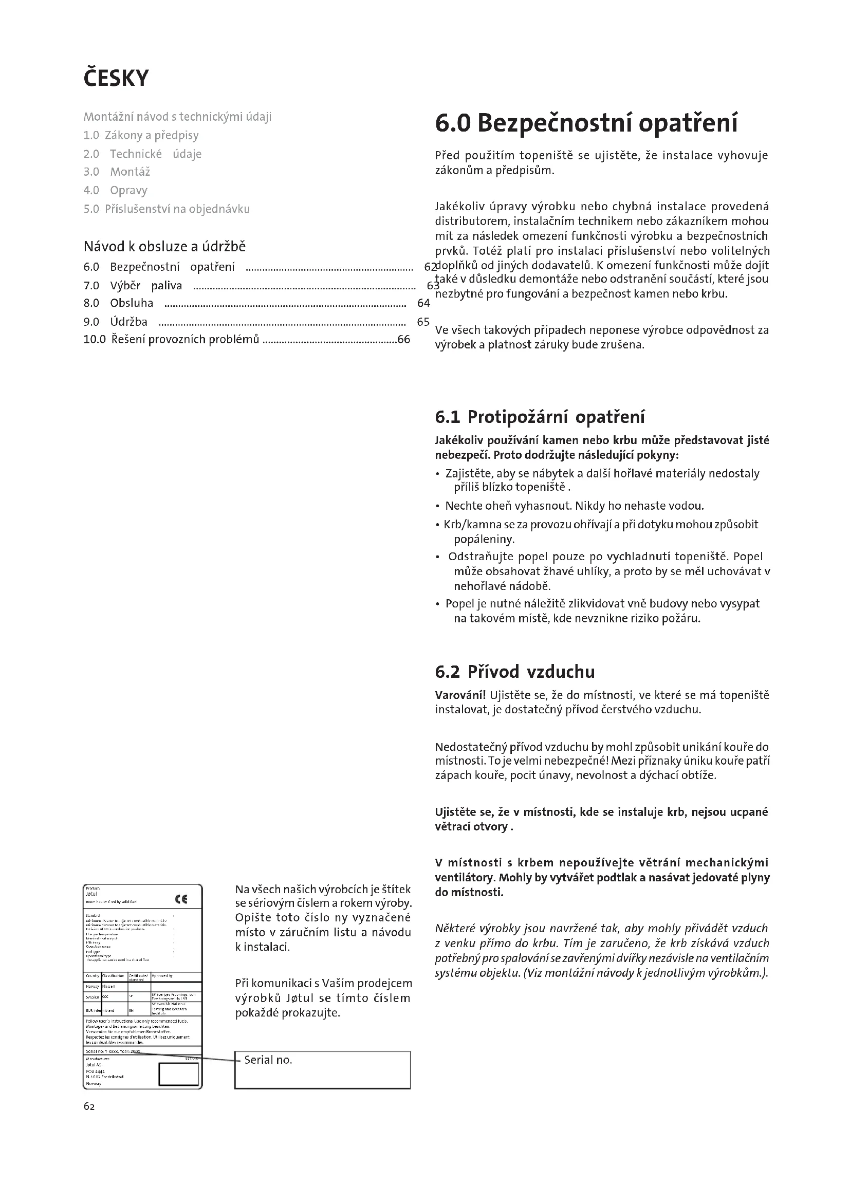 Varování! Ujistěte se, že do místnosti, ve které se má topeniště instalovat, je dostatečný přívod čerstvého vzduchu. Nedostatečný přívod vzduchu by mohl způsobit unikání kouře do místnosti. To je velmi nebezpečné! Mezi příznaky úniku kouře patří zápach kouře, pocit únavy, nevolnost a dýchací obtíže. Ujistěte se, že v místnosti, kde se instaluje krb, nejsou ucpané větrací otvory . V místnosti s krbem nepoužívejte větrání mechanickými ventilátory. Mohly by vytvářet podtlak a nasávat jedovaté plyny do místnosti. Některé výrobky jsou navržené tak, aby mohly přivádět vzduch z venku přímo do krbu. Tím je zaručeno, že krb získává vzduch potřebný pro spalování se zavřenými dvířky nezávisle na ventilačním systému objektu. (Viz montážní návody k jednotlivým výrobkům.). ČESKY Na všech našich výrobcích je štítek se sériovým číslem a rokem výroby. Opište toto číslo ny vyznačené místo v záručním listu a návodu k instalaci. Při komunikaci s Vaším prodejcem výrobků Jøtul se tímto číslem pokaždé prokazujte. les combustibles recommandés.Respectez les consignes d'utilisation. Utilisez uniquementVerwenden Sie nur empfohlenen Brennstoffen.Montage- und Bedienungsanleitung beachten. Follow user`s instructions. Use only recommended fuels.standardCertificate/The appliance can be used in a shared flue.Minimum distance to adjacent combustible materials:Emission of CO in combustion productsSerial no: Y-xxxx, Year: 200xManufacturer:N-1602 FredrikstadNorwayJøtul ASPOB 1441SwedenEUR IntermittentNominal heat output NorwayCountryOperational typeFuel typeOperation rangeEfficiencyKlasse IIClassificationStandardFlue gas temperature Room heater fired by solid fuelProduct: Jøtul SP Sveriges Provnings- och221546Forskningsinstitut ABSP Swedish National Testing and ResearchInstitute Approved by