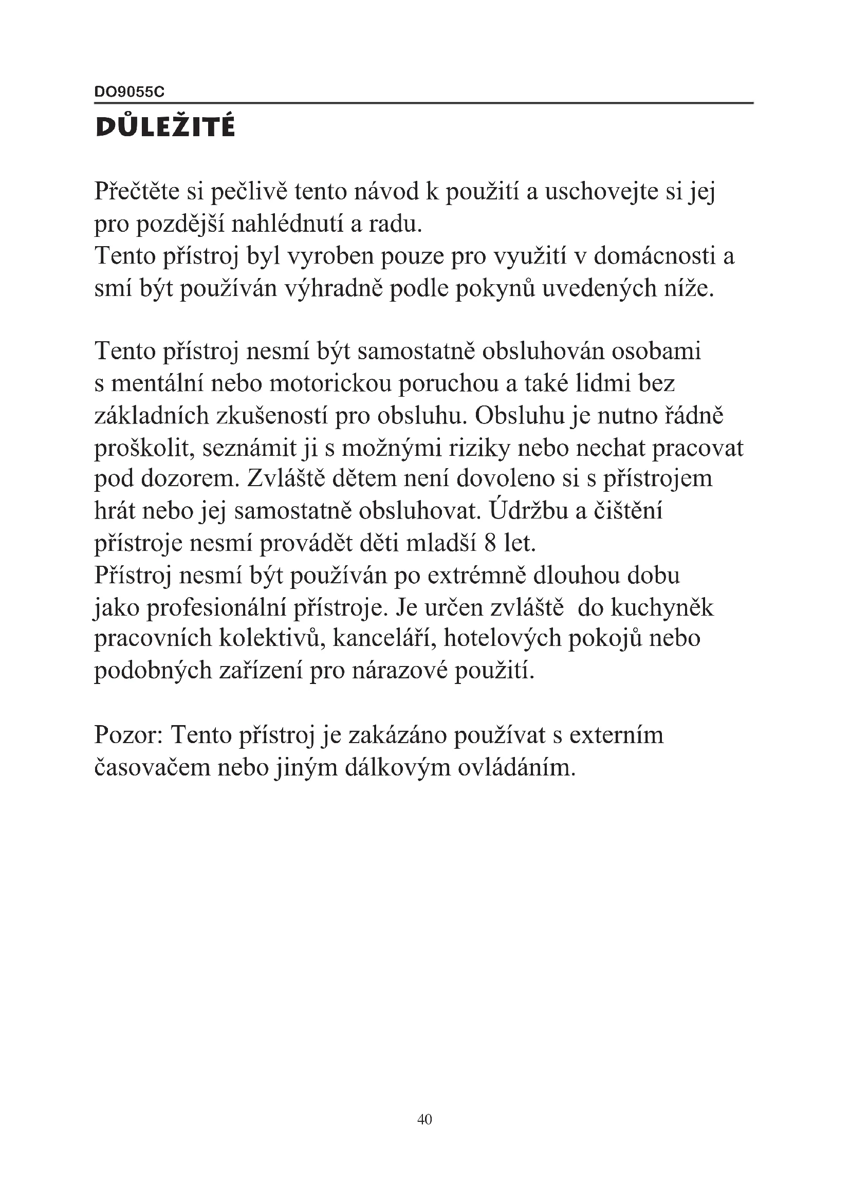 Pozor: Tento prístroj je zakázáno používat s externím chasovačem nebo jiným dalkovým ovladáním.