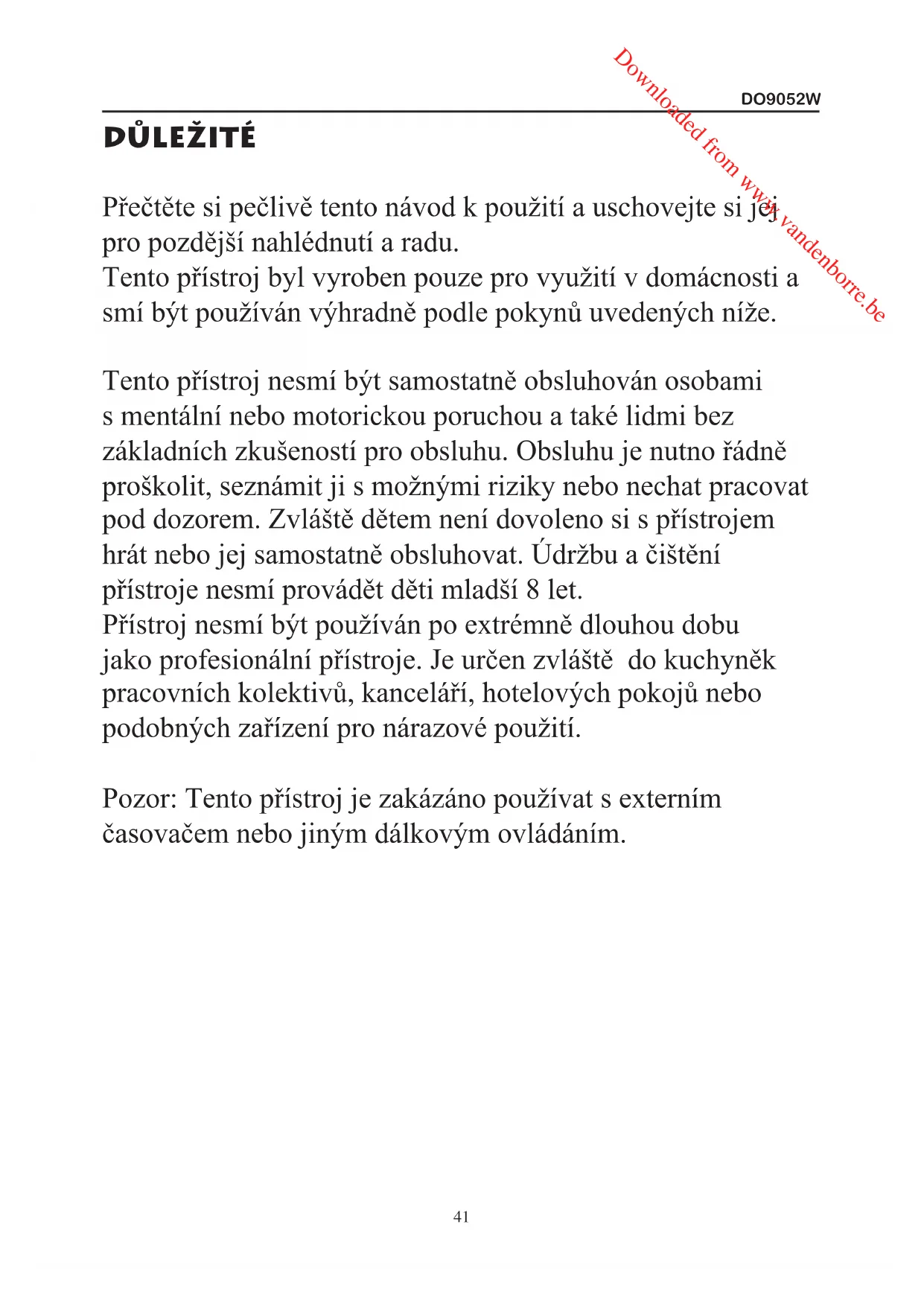 DŮLEŽITé Přečtěte si pečlivě tento návod k použití a uschovejte si jej pro pozdější nahlédnutí a radu. Tento přístroj byl vyroben pouze pro využití v domácnosti a smí být používán výhradně podle pokynů uvedených níže. Tento přístroj nesmí být samostatně obsluhován osobami s mentální nebo motorickou poruchou a také lidmi bez základních zkušeností pro obsluhu. Obsluhu je nutno řádně proškolit, seznámit ji s možnými riziky nebo nechat pracovat pod dozorem. Zvláště dětem není dovoleno si s přístrojem hrát nebo jej samostatně obsluhovat. Údržbu a čištění přístroje nesmí provádět děti mladší 8 let. Přístroj nesmí být používán po extrémně dlouhou dobu jako profesionální přístroje. Je určen zvláště do kuchyněk pracovních kolektivů, kanceláří, hotelových pokojů nebo podobných zařízení pro nárazové použití. Pozor: Tento přístroj je zakázáno používat s externím časovačem nebo jiným dálkovým ovládáním. Downloaded from www.vandenborre.beDO9052W