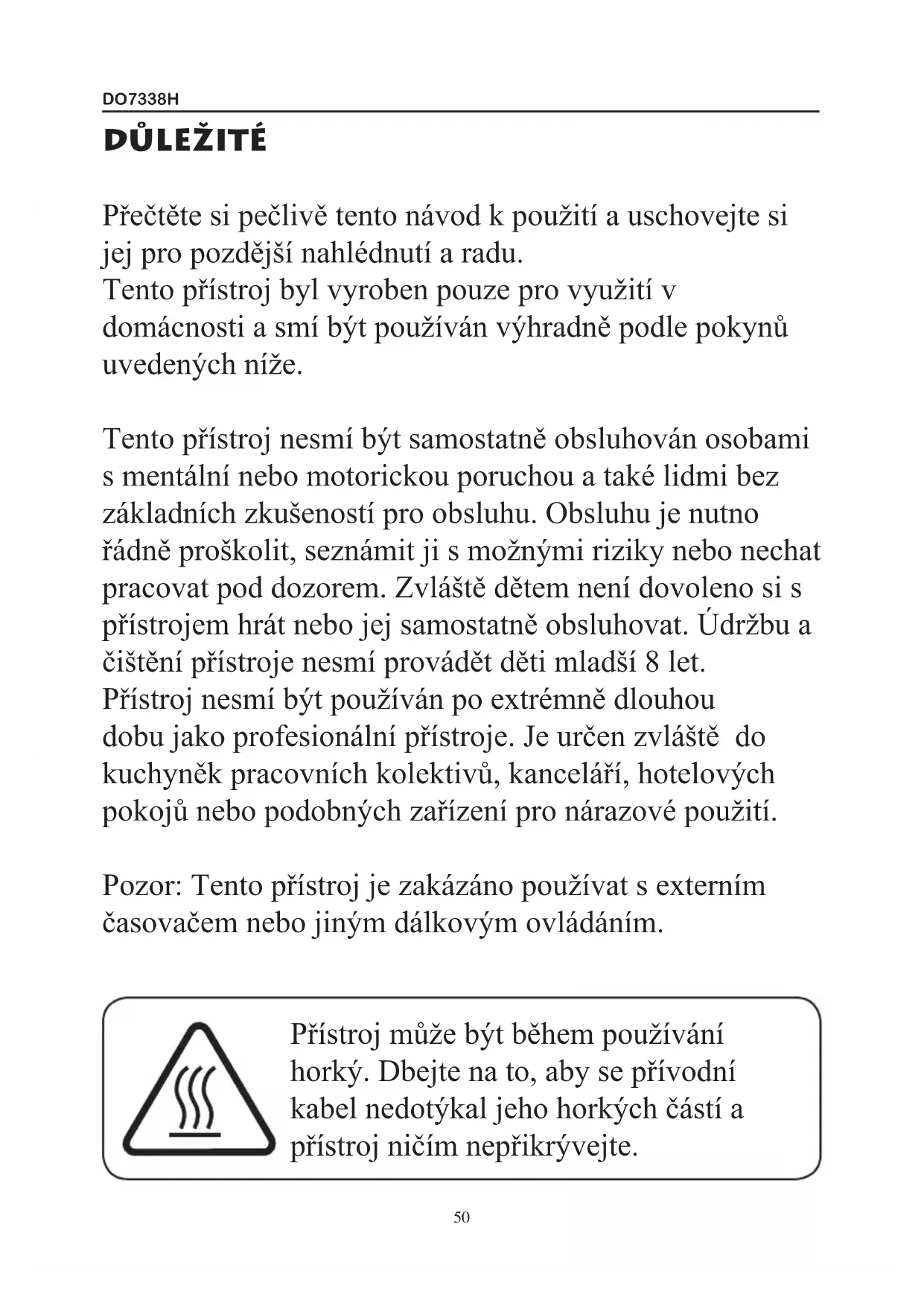 Přečtěte si pečlivě tento návod k použití a uschovejte si jej pro pozdější nahlédnutí a radu. Tento přístroj byl vyroben pouze pro využití v domácnosti a smí být používán výhradně podle pokynů uvedených níže. Tento přístroj nesmí být samostatně obsluhován osobami s mentální nebo motorickou poruchou a také lidmi bez základních zkušeností pro obsluhu. Obsluhu je nutno řádně proškolit, seznámit ji s možnými riziky nebo nechat pracovat pod dozorem. Zvláště dětem není dovoleno si s přístrojem hrát nebo jej samostatně obsluhovat. Údržbu a čištění přístroje nesmí provádět děti mladší 8 let. Přístroj nesmí být používán po extrémně dlouhou dobu jako profesionální přístroje. Je určen zvláště do kuchyněk pracovních kolektivů, kanceláří, hotelových pokojů nebo podobných zařízení pro nárazové použití. Pozor: Tento přístroj je zakázáno používat s externím časovačem nebo jiným dálkovým ovládáním. Přístroj může být během používání horký. Dbejte na to, aby se přívodní kabel nedotýkal jeho horkých částí a přístroj ničím nepřikrývejte.DO7338H