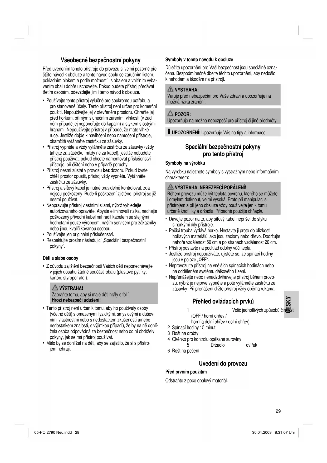 - Nepřenášejte nebo nenadzdvihávejte přístroj během provo- zu, nýbrž je nejprve vypněte a poté vytáhněte zástrčku ze zásuvky. Při přenášení držte přístroj vždy oběma rukama! Přehled ovládacích prvků 1 Volič jednotlivých způsobů činnosti (OFF / horní ohřev / horní a dolní ohřev / dolní ohřev) 2 Spínací hodiny 15 minut 3 Rošt na drobty 4 Okénko pro kontrolu opékané suroviny 5 Držadlo dvířek 6 Rošt na pečení Uvedení do provozu Před prvním použitím Odstraňte z pece obalový materiál. 05-PO 2790 Neu.indd 2905-PO 2790 Neu.indd 29 30.04.2009 8:31:07 Uhr30.04.2009 8:31:07 Uhr30 ČESKY ČESKY POZOR: Před prvním použitím nechte přístroj v provozu po dobu 15 mi- nut, aby došlo k odstranění ochranné vrstvy na topné spirále. Nastavte regulátor teploty na 250°C. UPOZORNĚNÍ: Lehký vývin kouře a zápachu je při tomto postupu normální. Zajistěte dostatečné větrání. Obsluha