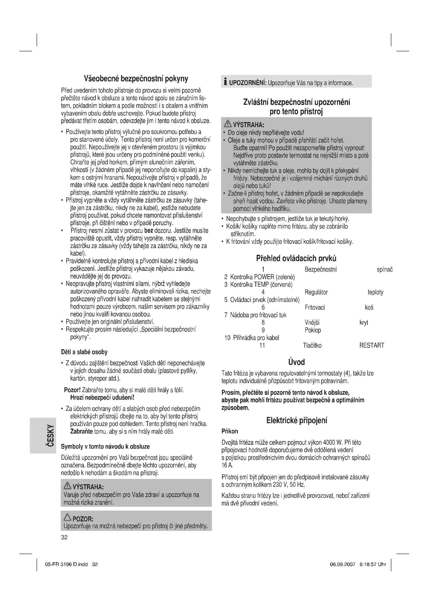 - K fritování vždy použijte fritovací košík/fritovací košíky. Přehled ovládacích prvků 1 Bezpečnostní spínač 2 Kontrolka POWER (zelené) 3 Kontrolka TEMP (červené) 4 Regulátor teploty 5 Ovládací prvek (odnímatelné) 6 Fritovací koš 7 Nádoba pro fritovací tuk 8 Vnější kryt 9 Poklop 10 Přihrádka pro kabel 11 Tlačítko RESTART Úvod Tato fritéza je vybavena regulovatelnými termostaty (4), takže lze teplotu individuálně přizpůsobit fritovaným potravinám. Prosím, přečtěte si pozorně tento návod k obsluze, abyste pak mohli fritézu používat bezpečně a optimálním způsobem. Elektrické připojení Příkon Dvojitá fritéza může celkem pojmout výkon 4000 W. Při této připojovací hodnotě doporučujeme dvě oddělená vedení s pojistkou prostřednictvím dvou domácích ochranných spínačů 16 A. Přístroj smí být připojen jen do předpisově instalované zásuvky s ochranným kolíkem 230 V, 50 Hz. Každou stranu fritézy lze i jednotlivě provozovat, neboť zařízení má dvě přívodní vedení. 05-FR 3196 D.indd 3205-FR 3196 D.indd 32 06.09.2007 8:18:57 Uhr06.09.2007 8:18:57 Uhr33 ČESKY ČESKY