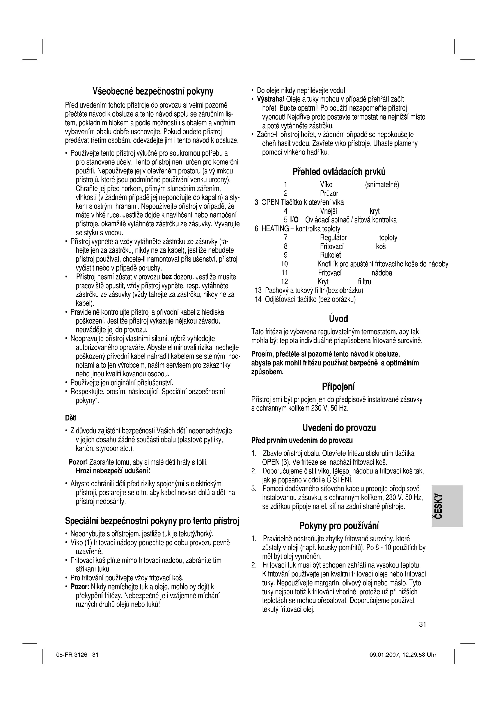 - Začne-li přístroj hořet, v žádném případě se nepokoušejte oheň hasit vodou. Zavřete víko přístroje. Uhaste plameny pomocí vlhkého hadříku. Přehled ovládacích prvků 1 Víko (snímatelné) 2 Průzor 3 OPEN Tlačítko k otevření víka 4 Vnější kryt 5 I/O – Ovládací spínač / síťová kontrolka 6 HEATING – kontrolka teploty 7 Regulátor teploty 8 Fritovací koš 9 Rukojeť 10 Knofl ík pro spuštění fritovacího koše do nádoby 11 Fritovací nádoba 12 Kryt fi ltru 13 Pachový a tukový fi ltr (bez obrázku) 14 Odjišťovací tlačítko (bez obrázku) Úvod Tato fritéza je vybavena regulovatelným termostatem, aby tak mohla být teplota individuálně přizpůsobena fritované surovině. Prosím, přečtěte si pozorně tento návod k obsluze, abyste pak mohli fritézu používat bezpečně a optimálním způsobem. Připojení Přístroj smí být připojen jen do předpisově instalované zásuvky s ochranným kolíkem 230 V, 50 Hz. Uvedení do provozu Před prvním uvedením do provozu