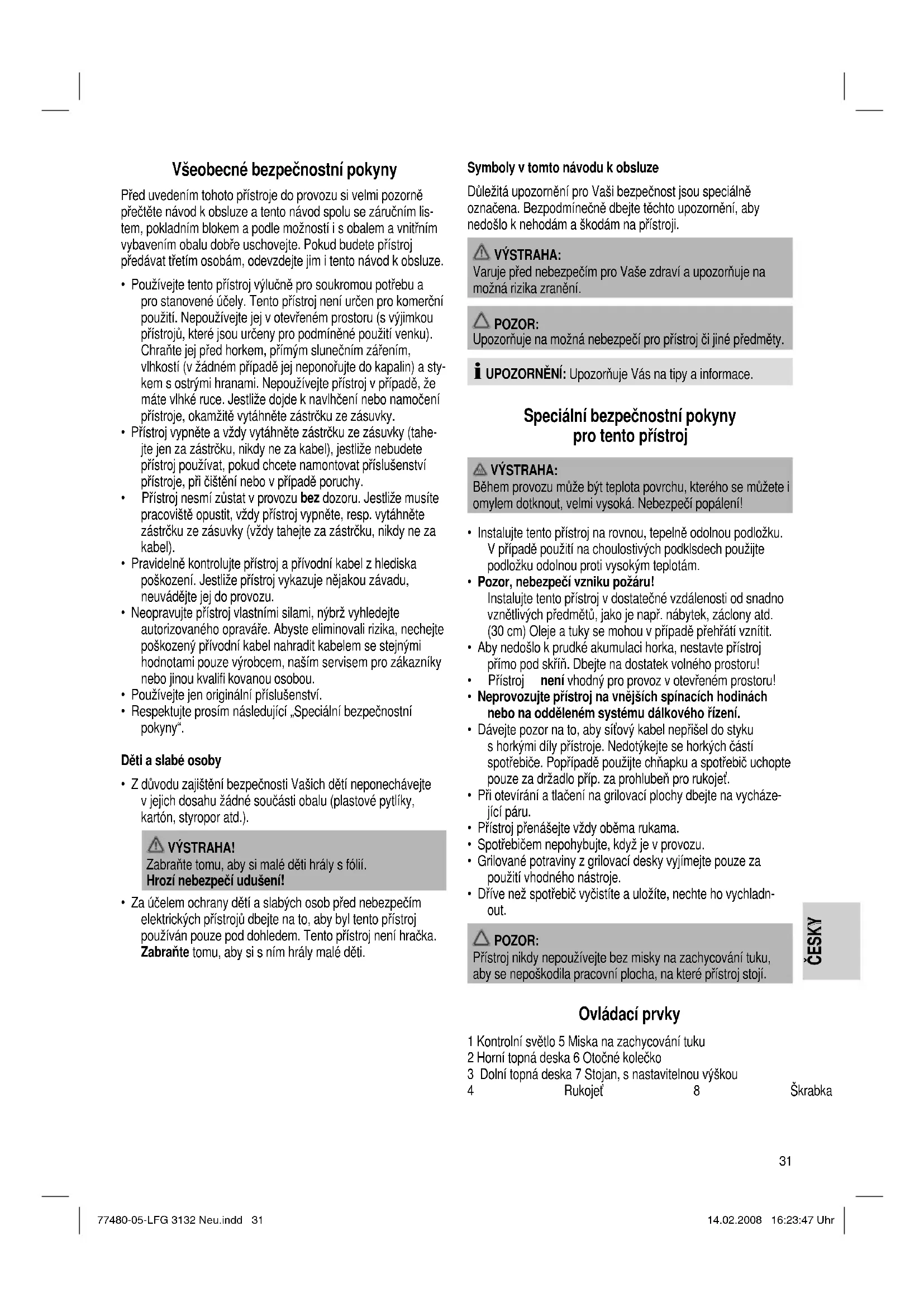 - Dříve než spotřebič vyčistíte a uložíte, nechte ho vychladn- out. POZOR: Přístroj nikdy nepoužívejte bez misky na zachycování tuku, aby se nepoškodila pracovní plocha, na které přístroj stojí. Ovládací prvky 1 Kontrolní světlo 5 Miska na zachycování tuku 2 Horní topná deska 6 Otočné kolečko 3 Dolní topná deska 7 Stojan, s nastavitelnou výškou 4 Rukojeť 8 Škrabka 77480-05-LFG 3132 Neu.indd 3177480-05-LFG 3132 Neu.indd 31 14.02.2008 16:23:47 Uhr14.02.2008 16:23:47 Uhr32 ČESKY ČESKY Uvedení přístroje do provozu Antiadhézní vrstva