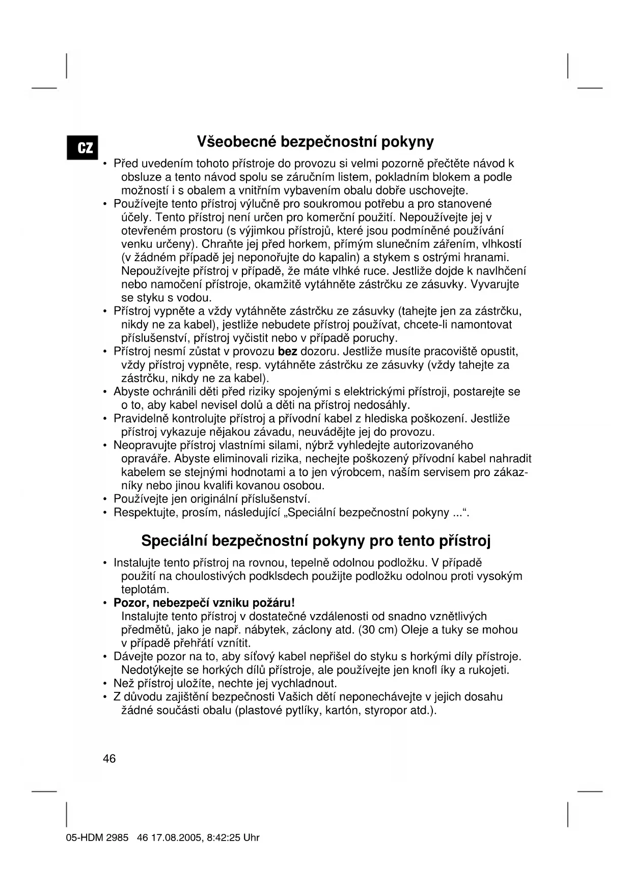 - Z důvodu zajištění bezpečnosti Vašich dětí neponechávejte v jejich dosahu žádné součásti obalu (plastové pytlíky, kartón, styropor atd.). 05-HDM 2985 46 17.08.2005, 8:42:25 UhrCZ