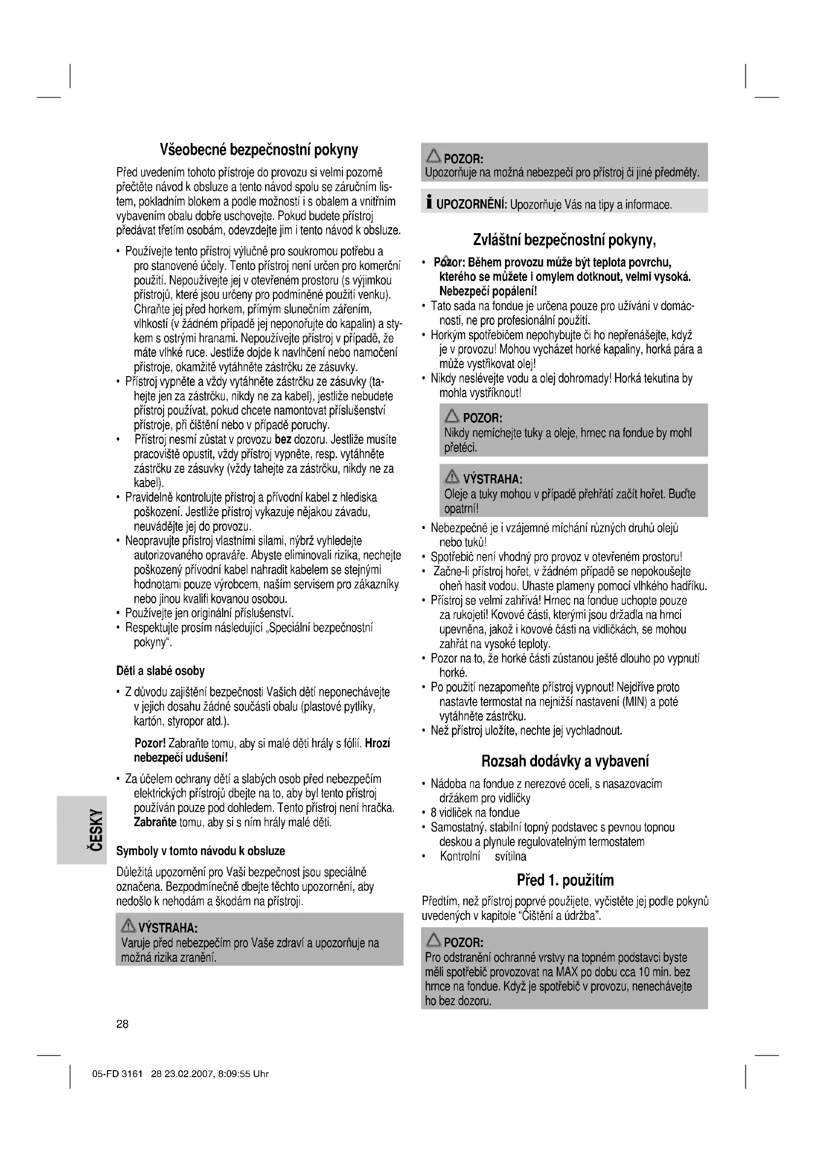 - Kontrolní svítilna Před 1. použitím Předtím, než přístroj poprvé použijete, vyčistěte jej podle pokynů uvedených v kapitole “Čištění a údržba”. POZOR: Pro odstranění ochranné vrstvy na topném podstavci byste měli spotřebič provozovat na MAX po dobu cca 10 min. bez hrnce na fondue. Když je spotřebič v provozu, nenechávejte ho bez dozoru. 05-FD 3161 28 23.02.2007, 8:09:55 Uhr29 ČESKY ČESKY UPOZORNĚNÍ: Lehký vývin kouře je normálním jevem. Zajistěte dostatečné odvětrání. Pokyny pro používání