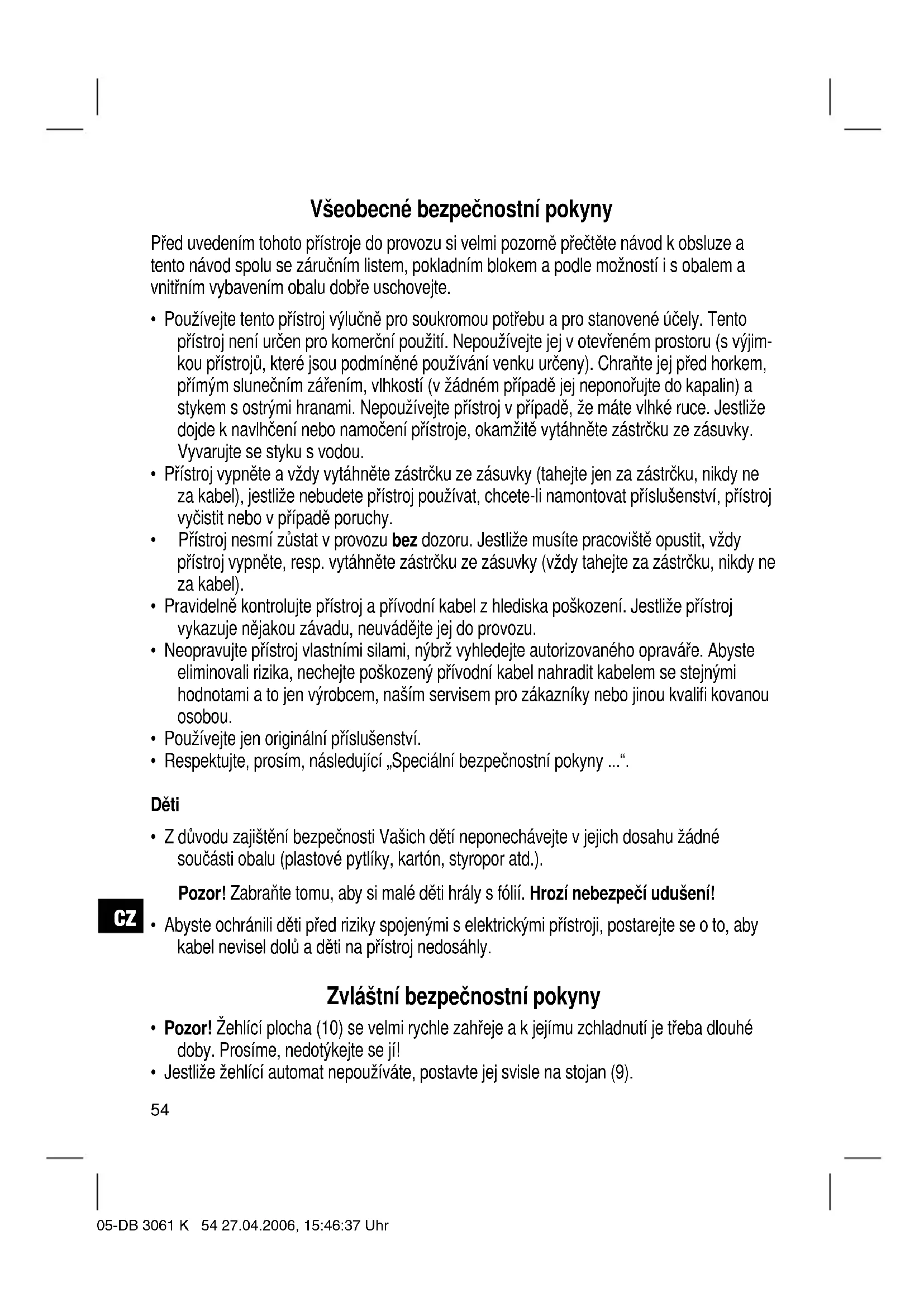 - Abyste ochránili děti před riziky spojenými s elektrickými přístroji, postarejte se o to, aby kabel nevisel dolů a děti na přístroj nedosáhly. Zvláštní bezpečnostní pokyny