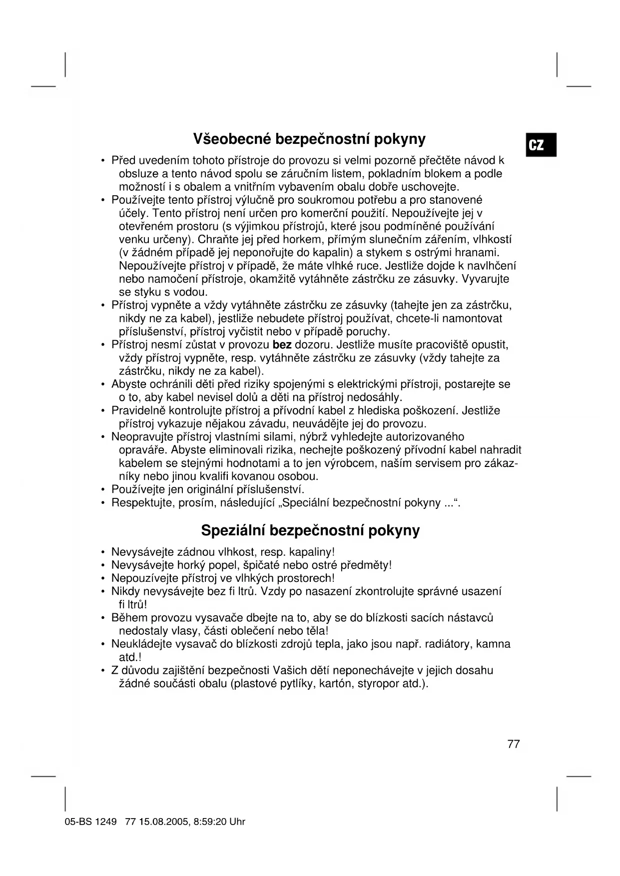 - Z důvodu zajištění bezpečnosti Vašich dětí neponechávejte v jejich dosahu žádné součásti obalu (plastové pytlíky, kartón, styropor atd.). 05-BS 1249 77 15.08.2005, 8:59:20 UhrCZ