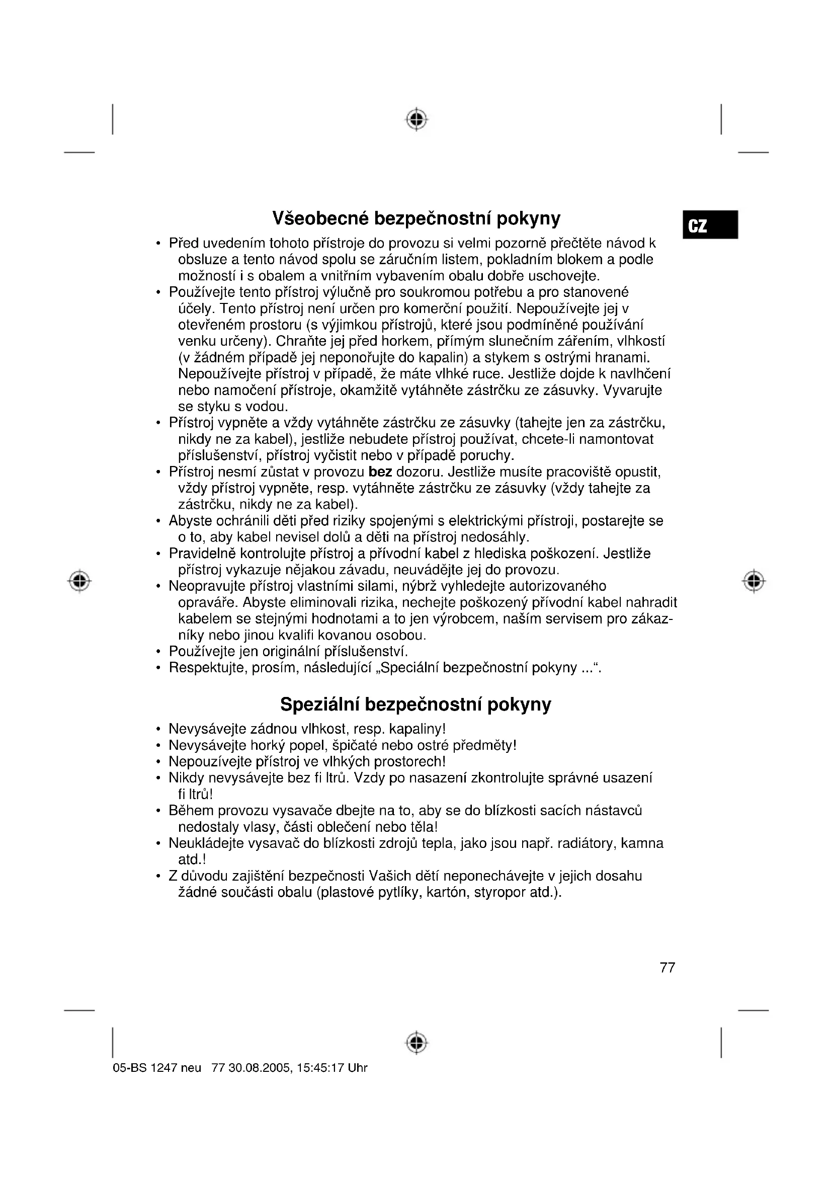 - Z důvodu zajištění bezpečnosti Vašich dětí neponechávejte v jejich dosahu žádné součásti obalu (plastové pytlíky, kartón, styropor atd.). 05-BS 1247 neu 77 30.08.2005, 15:45:17 UhrCZ