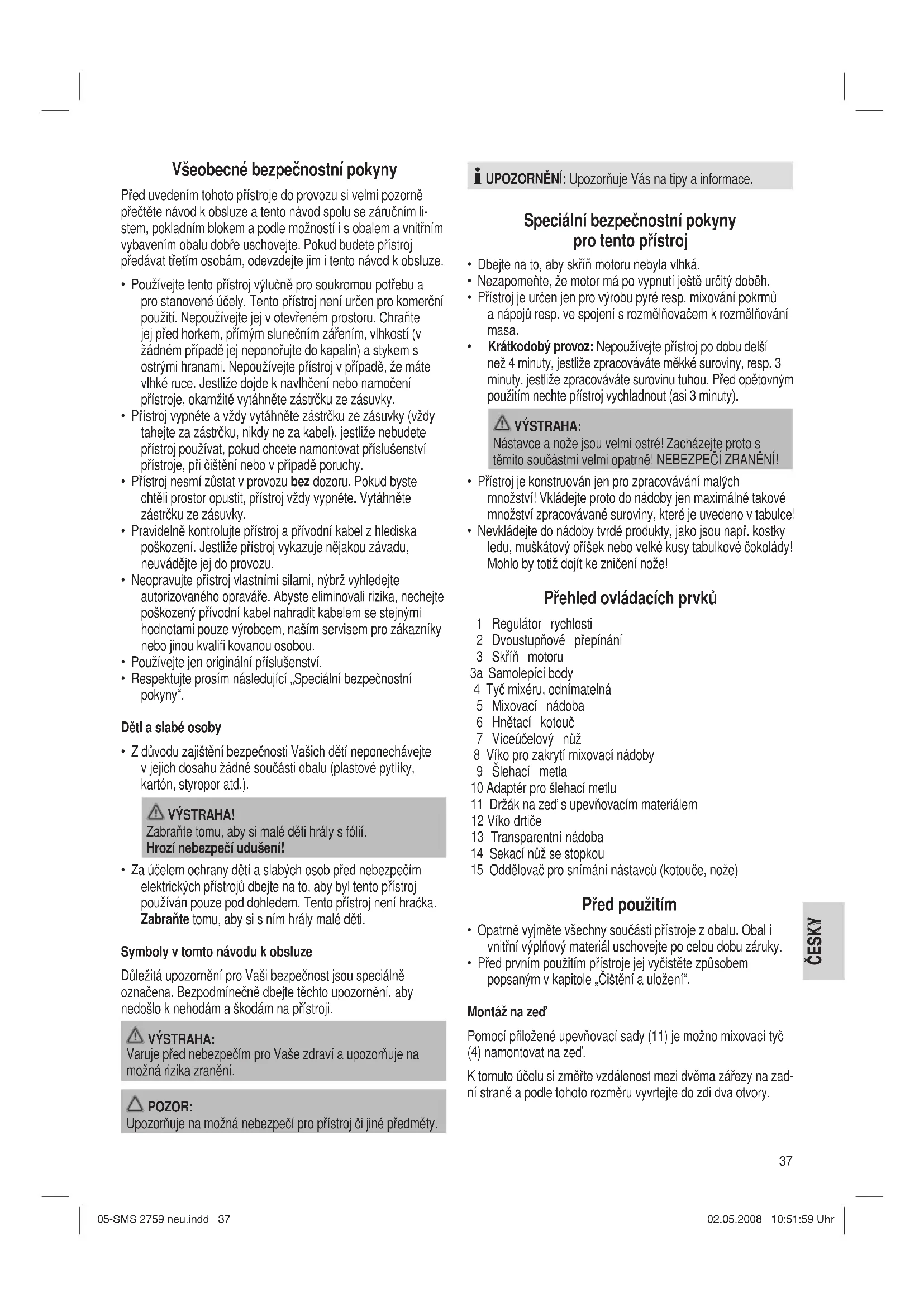 - Před prvním použitím přístroje jej vyčistěte způsobem popsaným v kapitole „Čištění a uložení“. Montáž na zeď Pomocí přiložené upevňovací sady (11) je možno mixovací tyč (4) namontovat na zeď. K tomuto účelu si změřte vzdálenost mezi dvěma zářezy na zad- ní straně a podle tohoto rozměru vyvrtejte do zdi dva otvory. 05-SMS 2759 neu.indd 3705-SMS 2759 neu.indd 37 02.05.2008 10:51:59 Uhr02.05.2008 10:51:59 Uhr38 ČESKY ČESKY POZOR: Předtím se ale ujistěte, že nepoškodíte elektrická vedení, která se nacházejí ve zdi! Těleso motoru (3) s mixovací tyčí (4) zavěste do držáku. Vyjmutí ponorného mixéru