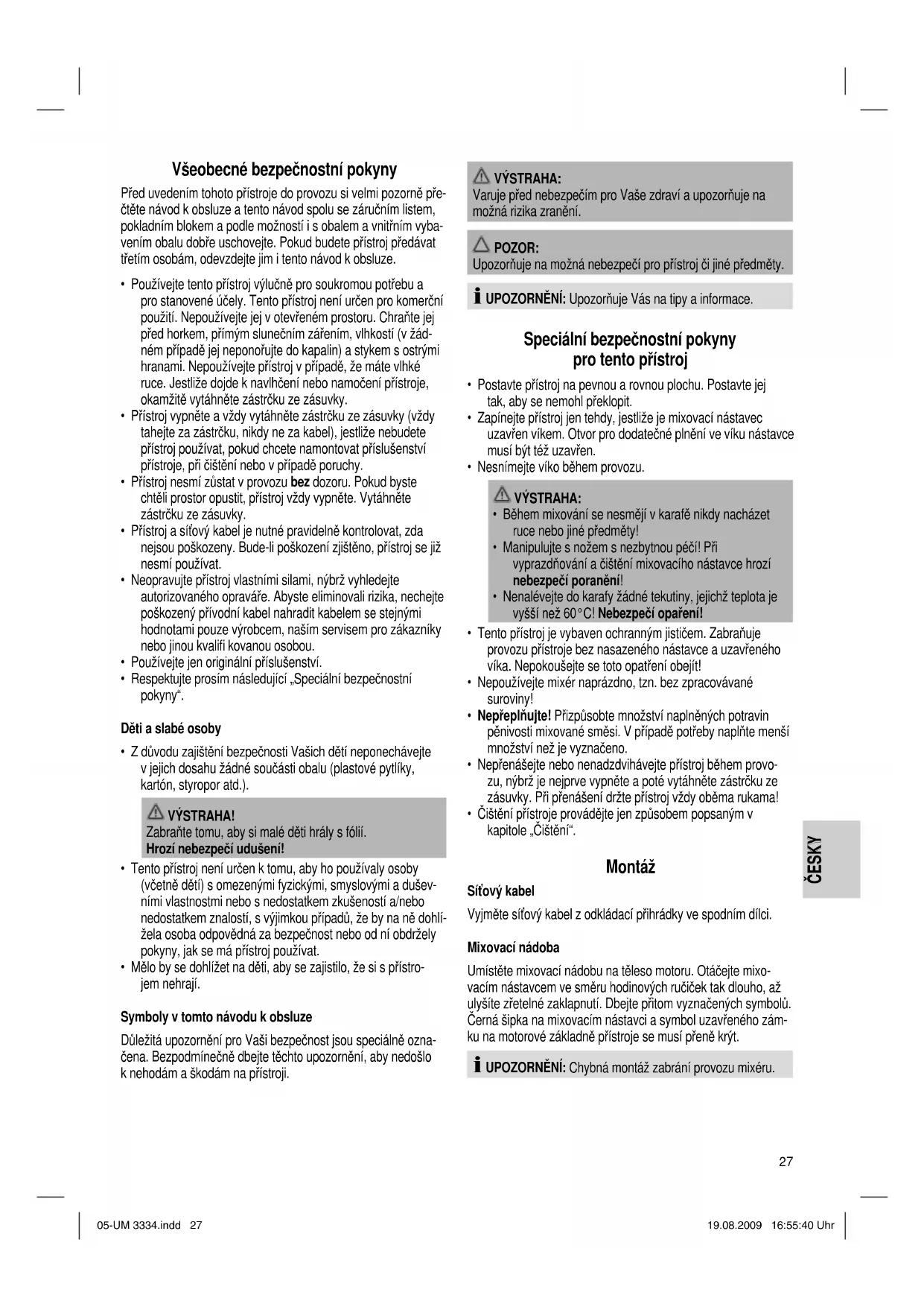 - Čištění přístroje provádějte jen způsobem popsaným v kapitole „Čištění“. Montáž Síťový kabel Vyjměte síťový kabel z odkládací přihrádky ve spodním dílci. Mixovací nádoba Umístěte mixovací nádobu na těleso motoru. Otáčejte mixo- vacím nástavcem ve směru hodinových ručiček tak dlouho, až ulyšíte zřetelné zaklapnutí. Dbejte přitom vyznačených symbolů. Černá šipka na mixovacím nástavci a symbol uzavřeného zám- ku na motorové základně přístroje se musí přeně krýt. UPOZORNĚNÍ: Chybná montáž zabrání provozu mixéru. 05-UM 3334.indd 2705-UM 3334.indd 27 19.08.2009 16:55:40 Uhr19.08.2009 16:55:40 Uhr28 ČESKY ČESKY Pokyny pro použití