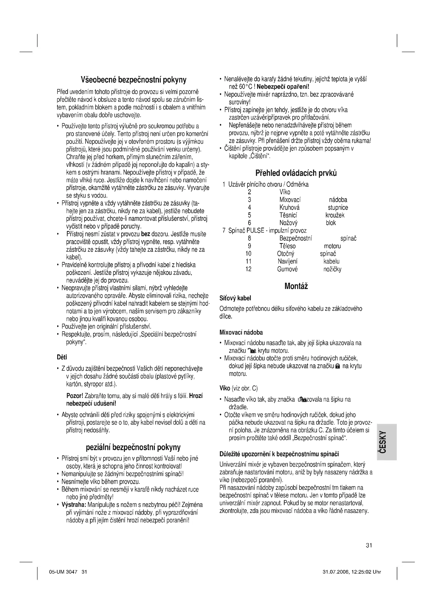 - Přístroj není funkční. Náprava: Zkontrolujte síťovou přípojku. Zkontrolujte polohu otočného spínače. Další možné příčiny: Váš přístroj je opatřen bezpečnostním spínačem. Zabraňuje samovolnému spuštění motoru. Náprava: Zkontrolujte, zda jsou mixovací nádoba a víko řádně nasazeny. 05-UM 3047 32 31.07.2006, 12:25:04 UhrČESKY