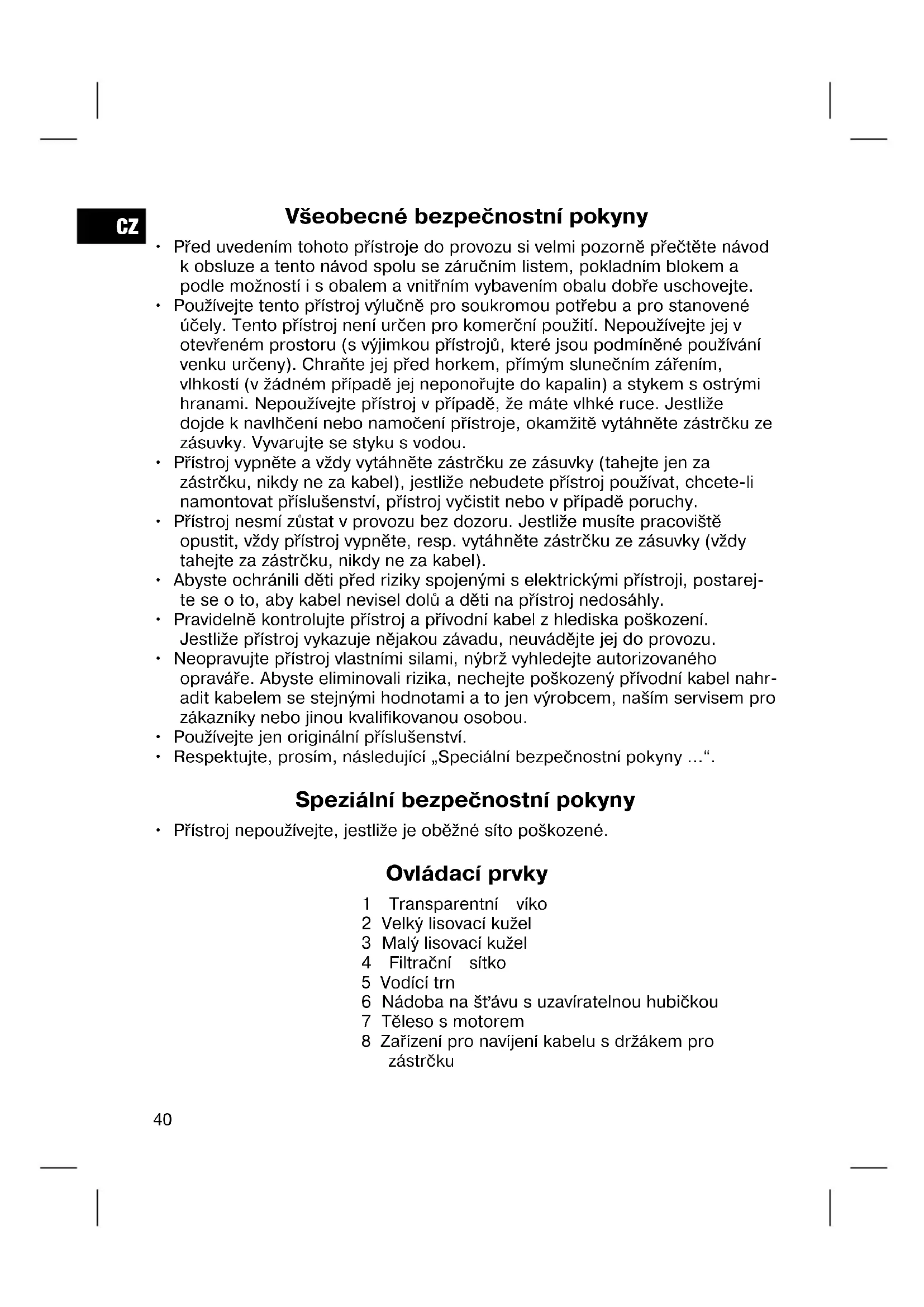 - Přístroj nepoužívejte, jestliže je oběžné síto poškozené. Ovládací prvky 1 Transparentní víko 2 Velký lisovací kužel 3 Malý lisovací kužel 4 Filtrační sítko 5 Vodící trn 6 Nádoba na šťávu s uzavíratelnou hubičkou 7 Těleso s motorem 8 Zařízení pro navíjení kabelu s držákem pro zástrčkuCZ