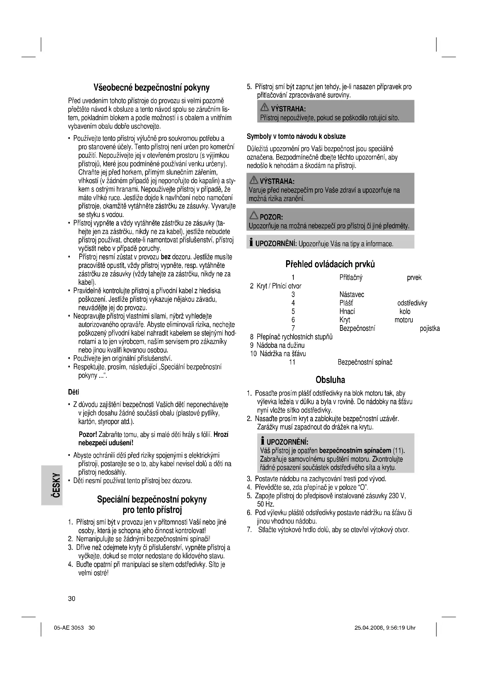 - Nechejte tyto díly dobře uschnout, než přístroj znovu smon- tujete. Odstranění poruch Přístroj není funkční. Náprava: Zkontrolujte síťovou přípojku. Zkontrolujte polohu spínače. Další možné příčiny: Váš přístroj je opatřen bezpečnostním spínačem (11). Zabraňuje samovolnému spuštění motoru. Náprava: Zkontrolujte řádné posazení součástek odstředivého síta a krytu. Technické údaje Model: ..............................................................................AE 3053 Pokrytí napětí:...............................................220-240 V, 50/60 Hz Příkon:................................................................................. 800 W Třída ochrany: .............................................................................. Ι Doba krátkého provozu:.......................................................1 Min. Tento přístroj byl testován podle všech příslušných, v současné době platných směrnic CE, jako je např. elektromagnetická kompatibilita a direktiva o nízkonapěťové bezpečnosti, a byl zkonstruován podle nejnovějších bezpečnostně-technických předpisů. Vyhrazujeme si technické změny! Záruka Na námi prodaný přístroj poskytujeme záruku v trvání 24 měsíců od data prodeje (pokladní doklad). Během záruční lhůty odstraníme bezplatně všechny vady přístroje nebo příslušenství, které vzniknou v důsledku vad materiálu nebo výrobních vad, a to opravou nebo, podle našeho uvážení, formou výměny. Záruční plnění nemají za následek ani prodloužení záruční doby ani tím nevzniká nárok na novou záruku! 05-AE 3053 31 25.04.2006, 9:56:24 Uhr32 ČESKY ČESKY Jako záruční doklad slouží doklad o koupi. Bez tohoto dokladu nelze uskutečnit bezplatnou výměnu nebo bezplatnou opravu. V případě uplatnění záruky předejte, prosím, kompletní přístroj v originálním obalu spolu s pokladním dokladem Vašemu obchodníkovi. Jak na vady na spotřebním příslušenství, resp. dílech podléha- jících rychlému opotřebení, tak i na čištění, údržbu nebo výměnu dílů podléhajících rychlému opotřebení se záruka nevztahuje a je proto nutno je uhradit! Záruka zaniká v případě, že dojde k zásahu neautorizovanou osobou. Po uplynutí záruky Po uplynutí záruční doby je možno za úplatu provést opravy v příslušném odborném obchodě nebo opravně. Význam symbolu „Popelnice“ Chraňte naše životní prostředí, elektropřístroje nepatří do domovního odpadu. Pro likvidaci elektropřístrojů použijte určených sběrných míst a odevzdejte zde elektropřístroje, jestliže už nebudete používat. Pomůžete tak předejít možným negativním dopadům na životní prostředí a lidské zdraví, ke kterým by mohlo dojít v důsledku nesprávné likvidace. Přispějete tím ke zhodnocení, recyklaci a dalším formám zhod- nocení starých elektronických a elektrických přístrojů. Informace o tom, kde lze tyto přístroje odevzdat k likvidaci, obdržíte prostřednictvím územně správních celků nebo obecního úřadu. 05-AE 3053 32 25.04.2006, 9:56:29 UhrČESKY