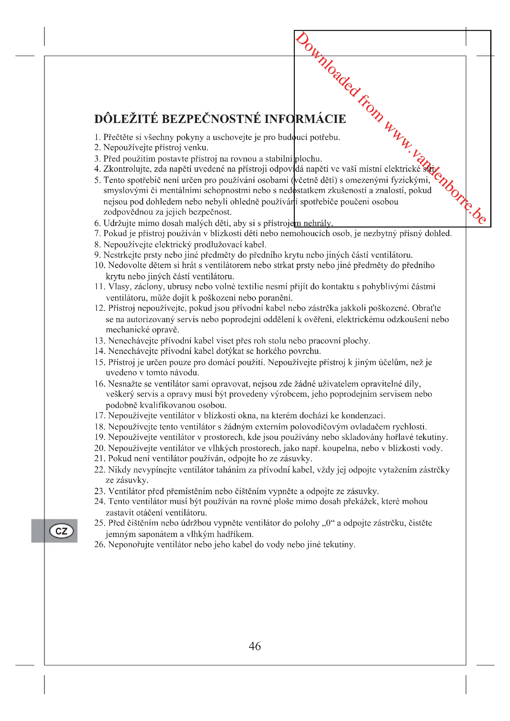 26. Neponořujte ventilátor nebo jeho kabel do vody nebo jiné tekutiny.