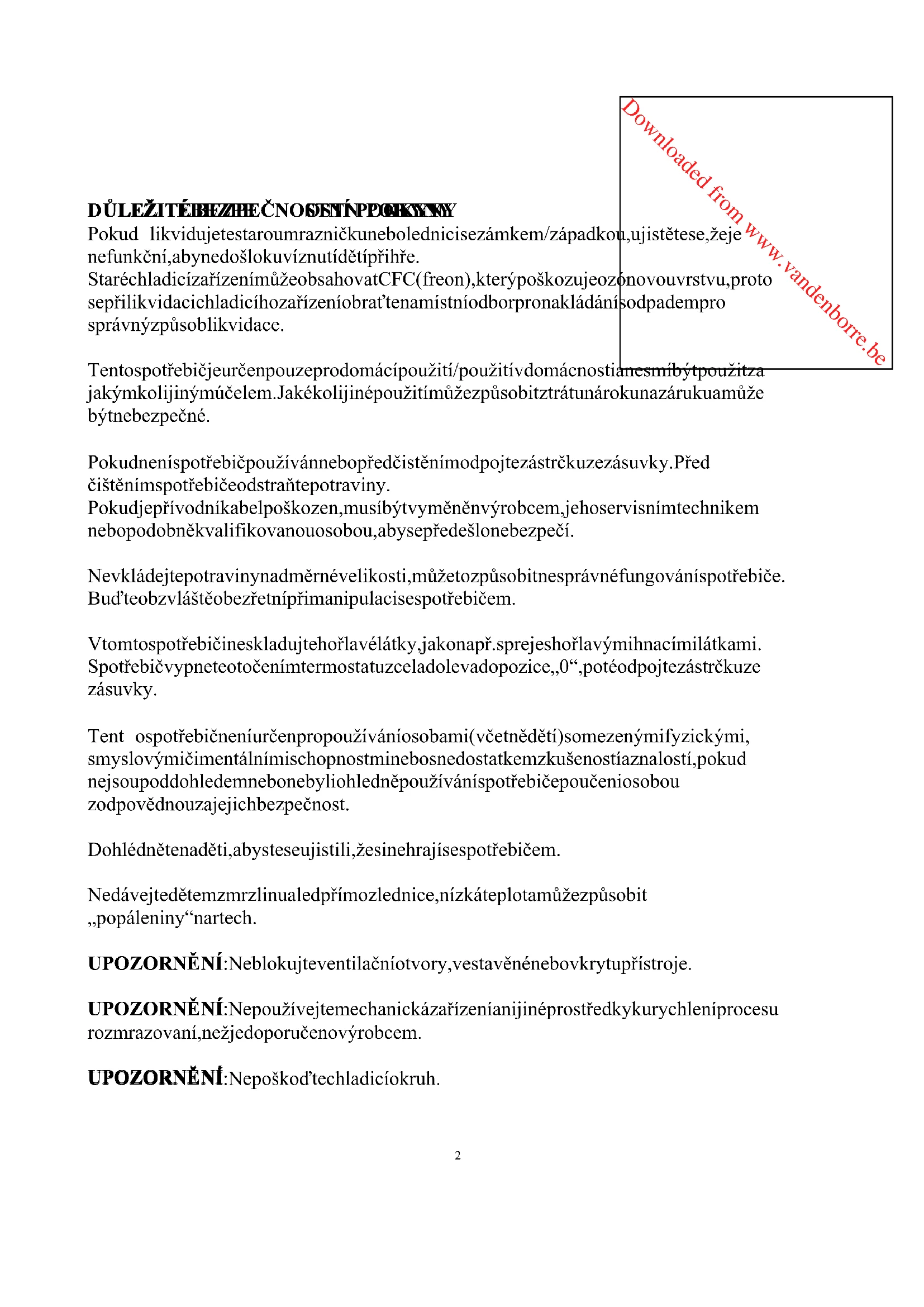 íregulace regulace regulace r egulaceteploty teploty teploty teploty Ledn icejeovládánapomocíknoflíkuregulaceteplotyumístěnéhouvnitřspotřebiče, vpravémhornímrohu.Pronižšíteplotuotočteknoflíkemdopravazpozice„STOP“(„0“)na vyššíčíslo. Vyššínastavenínaknoflíku(vyššíčíslo)znamenánižšíteplotu(chladnější)vcelémprostoru spotřebiče. Změnyokolníteplotyovlivňujíteplotuuvnitřspotřebiče,protozvoltesprávnénastavení knoflíkuregulaceteploty,vzávislostinaokolníchpodmínkách. Vpozici„STOP“(„0“)spotřebičnefunguje(chladicísystémjevypnutý),alenapájenínení přerušeno.Downloaded from www.vandenborre.be