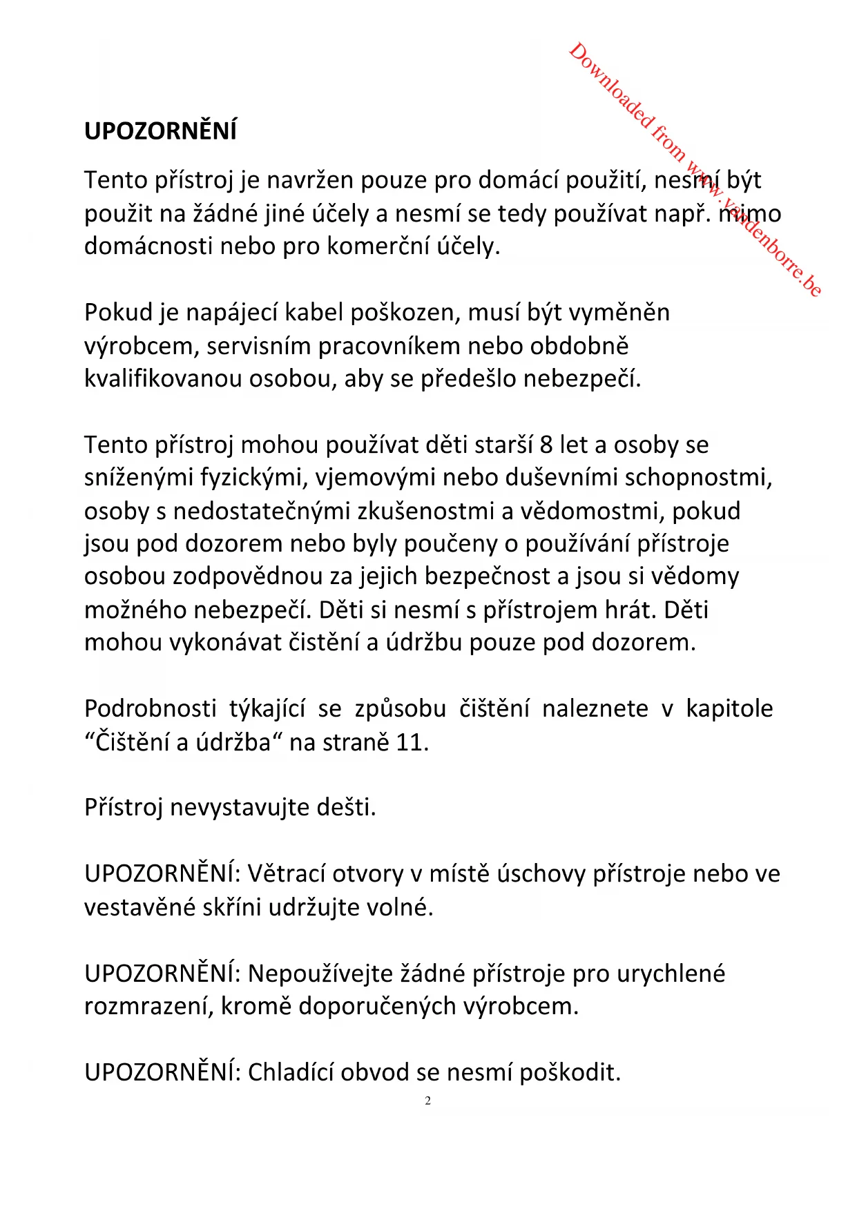 NEŽ VLOŽÍTE JÍDLO DO CHLADNIČKY NEBO MRAZNIČKY.............................................................................. 6 Downloaded from www.vandenborre.beUPOZORNĚNÍ Tento přístroj je navržen pouze pro domácí použití, nesmí být použit na žádné jiné účely a nesmí se tedy používat např. mimo domácnosti nebo pro komerční účely. Pokud je napájecí kabel poškozen, musí být vyměněn výrobcem, servisním pracovníkem nebo obdobně kvalifikovanou osobou, aby se předešlo nebezpečí. Tento přístroj mohou používat děti starší 8 let a osoby se sníženými fyzickými, vjemovými nebo duševními schopnostmi, osoby s nedostatečnými zkušenostmi a vědomostmi, pokud jsou pod dozorem nebo byly poučeny o používání přístroje osobou zodpovědnou za jejich bezpečnost a jsou si vědomy možného nebezpečí. Děti si nesmí s přístrojem hrát. Děti mohou vykonávat čistění a údržbu pouze pod dozorem.