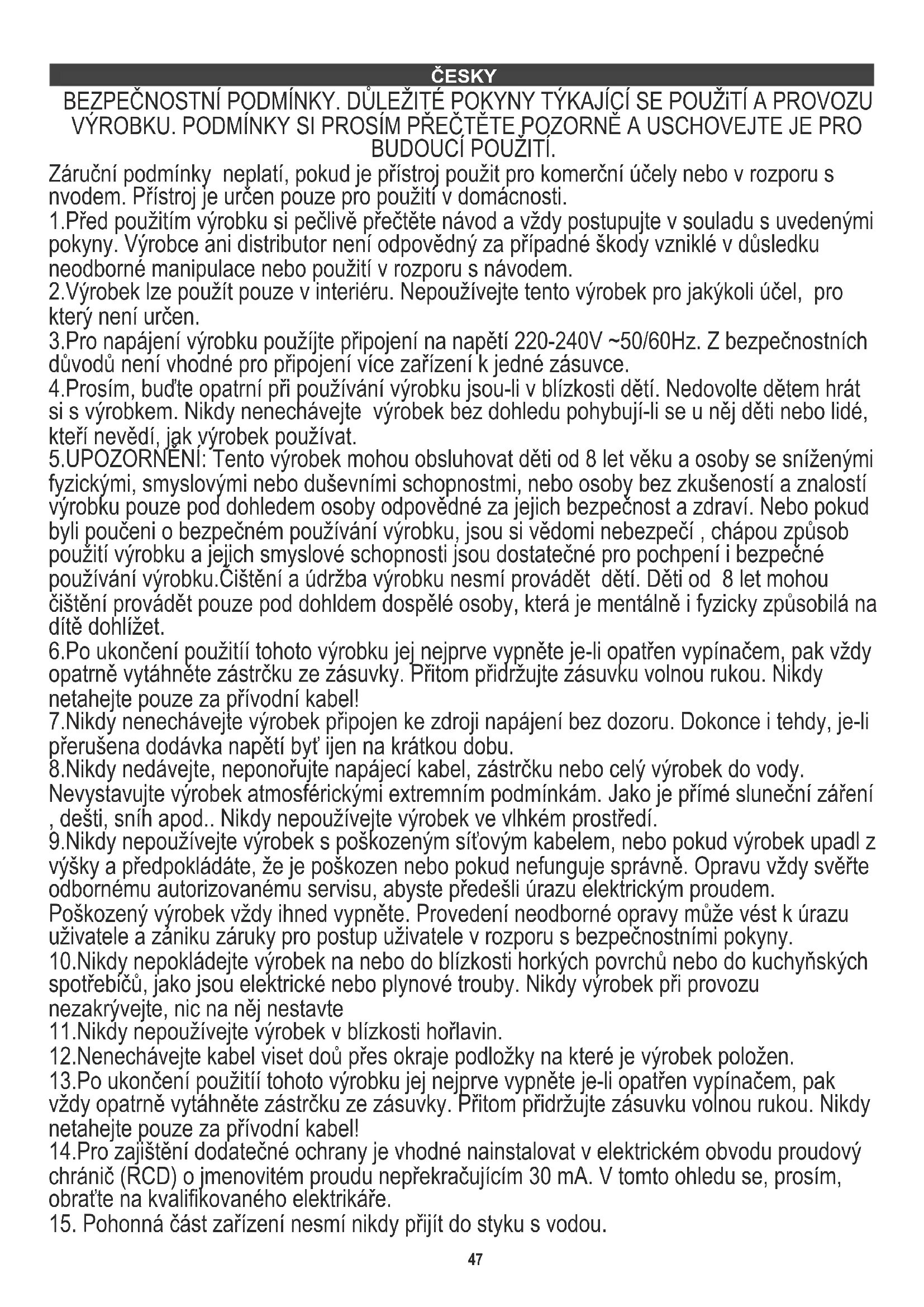 Napajanje: 220-240V ~50/60Hz Nominalna snaga: 1850W Maksimalna snaga:2200W Vodimo brigu o prirodnom okolišu. Kartonsku ambalažu molimo prenijeti na otpadni papir. Polietilen (PE) vreće bacati u kontejner za plastiku. Istrošena oprema treba biti premještena na prikladno mjesto za pohranu, jer sadrže u ureađju opasne tvari mogu predstavljati opasnost za okoliš. Električni uređaj mora biti predat u takvom stanju da se smanji mogučnost njegove ponovne upotrebe. Ako vaš uređaj ima baterije, treba njih ukloniti i predati na mjesto za pohranu odvojeno. 46BEZPEČNOSTNÍ PODMÍNKY. DŮLEŽITÉ POKYNY TÝKAJÍCÍ SE POUŽiTÍ A PROVOZU VÝROBKU. PODMÍNKY SI PROSÍM PŘEČTĚTE POZORNĚ A USCHOVEJTE JE PRO BUDOUCÍ POUŽITÍ. Záruční podmínky neplatí, pokud je přístroj použit pro komerční účely nebo v rozporu s nvodem. Přístroj je určen pouze pro použití v domácnosti. 1.Před použitím výrobku si pečlivě přečtěte návod a vždy postupujte v souladu s uvedenými pokyny. Výrobce ani distributor není odpovědný za případné škody vzniklé v důsledku neodborné manipulace nebo použití v rozporu s návodem. 2.Výrobek lze použít pouze v interiéru. Nepoužívejte tento výrobek pro jakýkoli účel, pro který není určen. 3.Pro napájení výrobku použíjte připojení na napětí 220-240V ~50/60Hz. Z bezpečnostních důvodů není vhodné pro připojení více zařízení k jedné zásuvce. 4.Prosím, buďte opatrní při používání výrobku jsou-li v blízkosti dětí. Nedovolte dětem hrát si s výrobkem. Nikdy nenechávejte výrobek bez dohledu pohybují-li se u něj děti nebo lidé, kteří nevědí, jak výrobek používat. 5.UPOZORNĚNÍ: Tento výrobek mohou obsluhovat děti od 8 let věku a osoby se sníženými fyzickými, smyslovými nebo duševními schopnostmi, nebo osoby bez zkušeností a znalostí výrobku pouze pod dohledem osoby odpovědné za jejich bezpečnost a zdraví. Nebo pokud byli poučeni o bezpečném používání výrobku, jsou si vědomi nebezpečí , chápou způsob použití výrobku a jejich smyslové schopnosti jsou dostatečné pro pochpení i bezpečné používání výrobku.Čištění a údržba výrobku nesmí provádět dětí. Děti od 8 let mohou čištění provádět pouze pod dohldem dospělé osoby, která je mentálně i fyzicky způsobilá na dítě dohlížet. 6.Po ukončení použitíí tohoto výrobku jej nejprve vypněte je-li opatřen vypínačem, pak vždy opatrně vytáhněte zástrčku ze zásuvky. Přitom přidržujte zásuvku volnou rukou. Nikdy netahejte pouze za přívodní kabel! 7.Nikdy nenechávejte výrobek připojen ke zdroji napájení bez dozoru. Dokonce i tehdy, je-li přerušena dodávka napětí byť ijen na krátkou dobu. 8.Nikdy nedávejte, neponořujte napájecí kabel, zástrčku nebo celý výrobek do vody. Nevystavujte výrobek atmosférickými extremním podmínkám. Jako je přímé sluneční záření , dešti, sníh apod.. Nikdy nepoužívejte výrobek ve vlhkém prostředí. 9.Nikdy nepoužívejte výrobek s poškozeným síťovým kabelem, nebo pokud výrobek upadl z výšky a předpokládáte, že je poškozen nebo pokud nefunguje správně. Opravu vždy svěřte odbornému autorizovanému servisu, abyste předešli úrazu elektrickým proudem. Poškozený výrobek vždy ihned vypněte. Provedení neodborné opravy může vést k úrazu uživatele a zániku záruky pro postup uživatele v rozporu s bezpečnostními pokyny. 10.Nikdy nepokládejte výrobek na nebo do blízkosti horkých povrchů nebo do kuchyňských spotřebičů, jako jsou elektrické nebo plynové trouby. Nikdy výrobek při provozu nezakrývejte, nic na něj nestavte 11.Nikdy nepoužívejte výrobek v blízkosti hořlavin. 12.Nenechávejte kabel viset doů přes okraje podložky na které je výrobek položen. 13.Po ukončení použitíí tohoto výrobku jej nejprve vypněte je-li opatřen vypínačem, pak vždy opatrně vytáhněte zástrčku ze zásuvky. Přitom přidržujte zásuvku volnou rukou. Nikdy netahejte pouze za přívodní kabel! 14.Pro zajištění dodatečné ochrany je vhodné nainstalovat v elektrickém obvodu proudový chránič (RCD) o jmenovitém proudu nepřekračujícím 30 mA. V tomto ohledu se, prosím, obraťte na kvalifikovaného elektrikáře.
