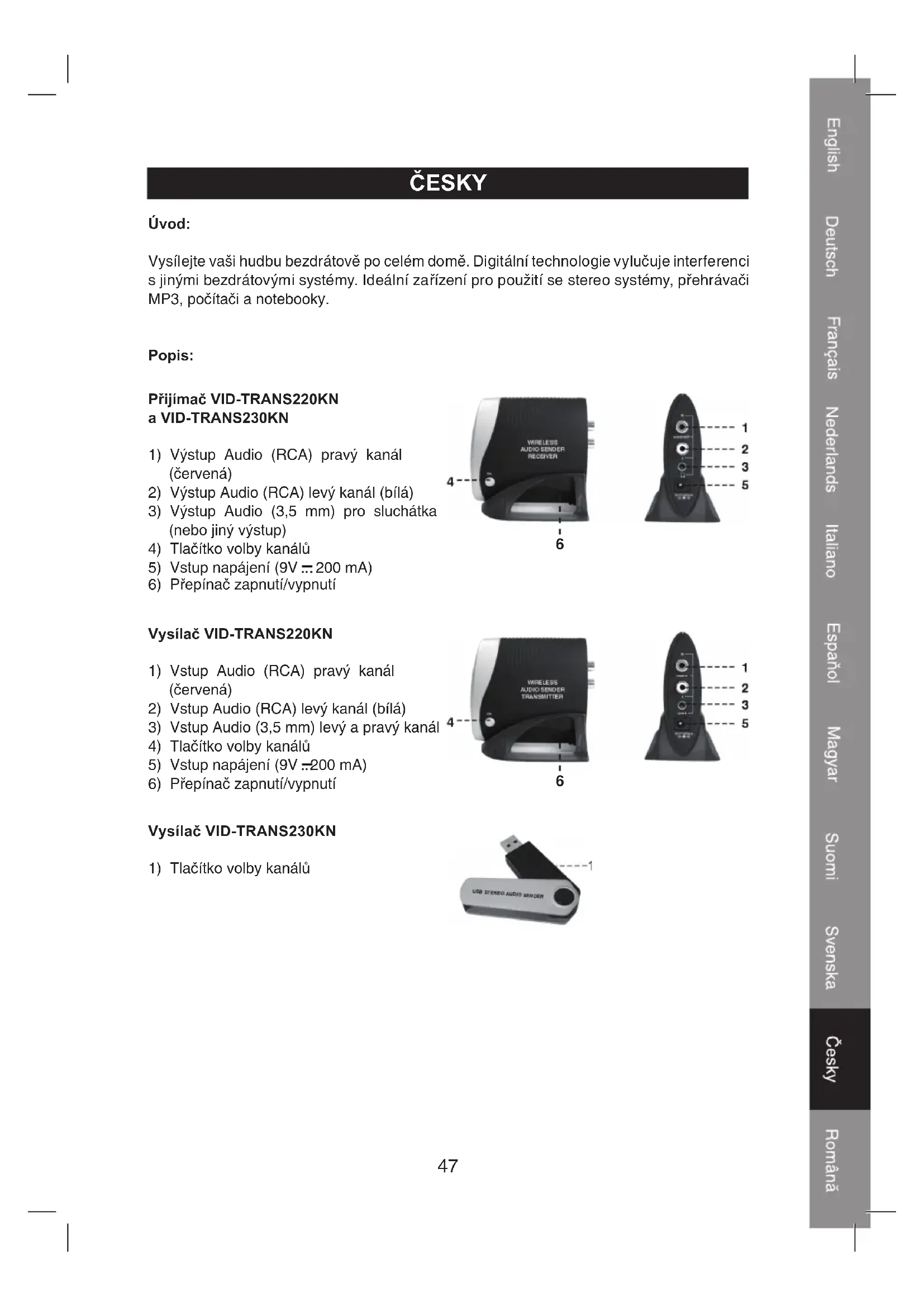 na přijímači. Přijímač se pak automaticky přeladí na nový aktuální kanál. Technické parametry: Vysílač VID-TRANS220KN Frekvenční rozsah: 2.400 ~ 2.483 GHz Kanály: 8 Modulace: FSK (klíčování kmitočtovým posuvem) Audio vstup: 2x RCA (R/L), 3,5 mm Napájecí napětí: 9 V/200 mA Vysílač VID-TRANS230KN Frekvenční rozsah: 2.400 ~ 2.483 GHz Kanály: 8 Modulace: FSK (klíčování kmitočtovým posuvem) Audio vstup: prostřednictvím USB portu Napájecí napětí: prostřednictvím USB portu Přijímač VID-TRANS220KN a VID-TRANS230KN Frekvenční rozsah: 2.400 ~ 2.483 GHz Kanály: 8 Modulace: FSK (klíčování kmitočtovým posuvem) Výstup zvuku: 2x RCA, 3,5 mm Odstup signálu: 87 dB Napájecí napětí: 9 V/200 mA50
