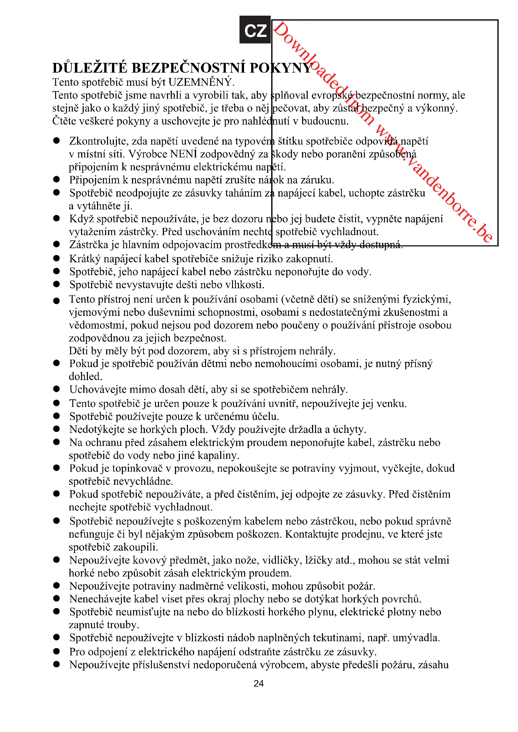 23Downloaded from www.vandenborre.be DģLEŽITÉ BEZPEýNOSTNÍ POKYNY Tento spotĜebiþ musí být UZEMNċNÝ. Tento spotĜebiþ jsme navrhli a vyrobili tak, aby splĖoval evropské bezpeþnostní normy, ale stejnČ jako o každý jiný spotĜebiþ, je tĜeba o nČj peþovat, aby zĤstal bezpeþný a výkonný. ýtČte veškeré pokyny a uschovejte je pro nahlédnutí v budoucnu. z Zkontrolujte, zda napČtí uvedené na typovém štítku spotĜebiþe odpovídá napČtí v místní síti. Výrobce NENÍ zodpovČdný za škody nebo poranČní zpĤsobená pĜipojením k nesprávnému elektrickému napČtí. z PĜipojením k nesprávnému napČtí zrušíte nárok na záruku. z SpotĜebiþ neodpojujte ze zásuvky taháním za napájecí kabel, uchopte zástrþku a vytáhnČte ji. z Když spotĜebiþ nepoužíváte, je bez dozoru nebo jej budete þistit, vypnČte napájení vytažením zástrþky. PĜed uschováním nechte spotĜebiþ vychladnout. z Zástrþka je hlavním odpojovacím prostĜedkem a musí být vždy dostupná. z Krátký napájecí kabel spotĜebiþe snižuje riziko zakopnutí. z SpotĜebiþ, jeho napájecí kabel nebo zástrþku neponoĜujte do vody. z SpotĜebiþ nevystavujte dešti nebo vlhkosti.