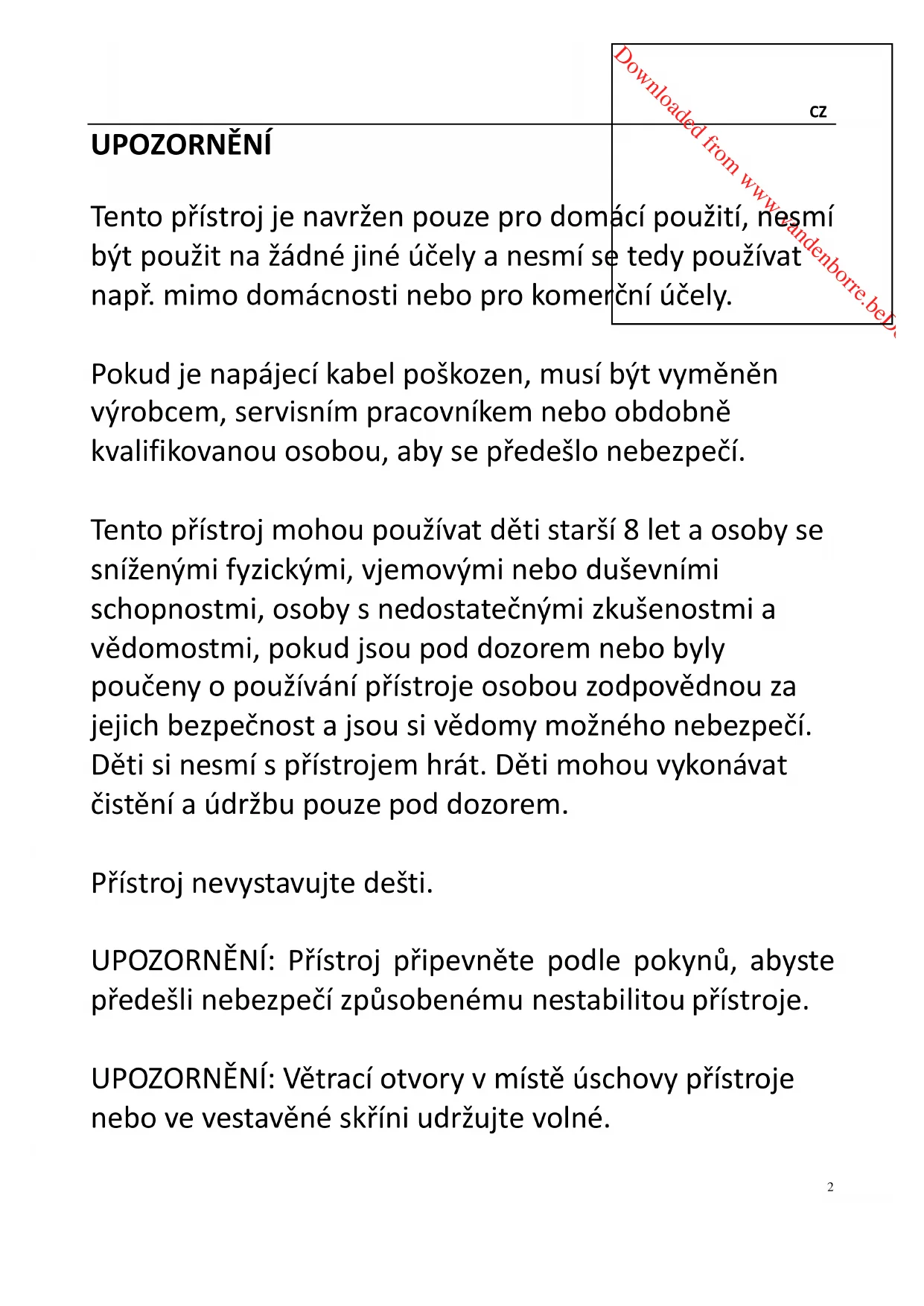 UPOZORNĚNÍ:Větracíotvoryvmístěúschovypřístroje nebovevestavěnéskříniudržujtevolné. Downloaded from www.vandenborre.beDownloaded from www.vandenborre.be