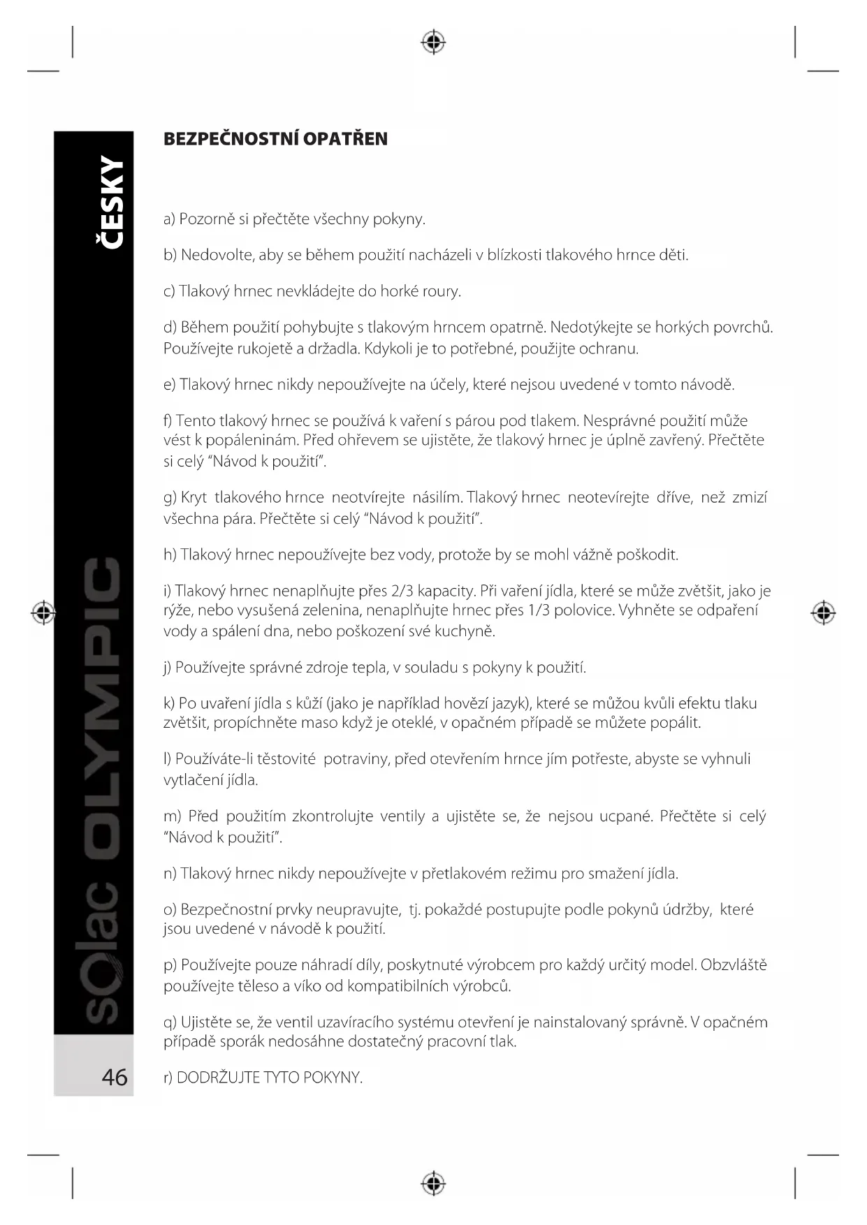 f) Tento tlakový hrnec se používa k vařeni s párou pod tlakem. Nesprávné použiti muže věst k popáleninám. Před ohřevem se ujistěte, ze tlakový hrnec je uplě zavřeny. Prčětěte si celý "Návod k použīti".