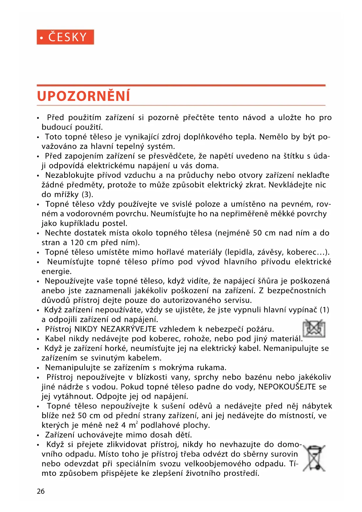 - Přístroj nepoužívejte v blízkosti vany, sprchy nebo bazénu nebo jakékoliv jiné nádrže s vodou. Pokud topné těleso padne do vody, NEPOKOUŠEJTE se jej vytáhnout. Odpojte jej od napájení.