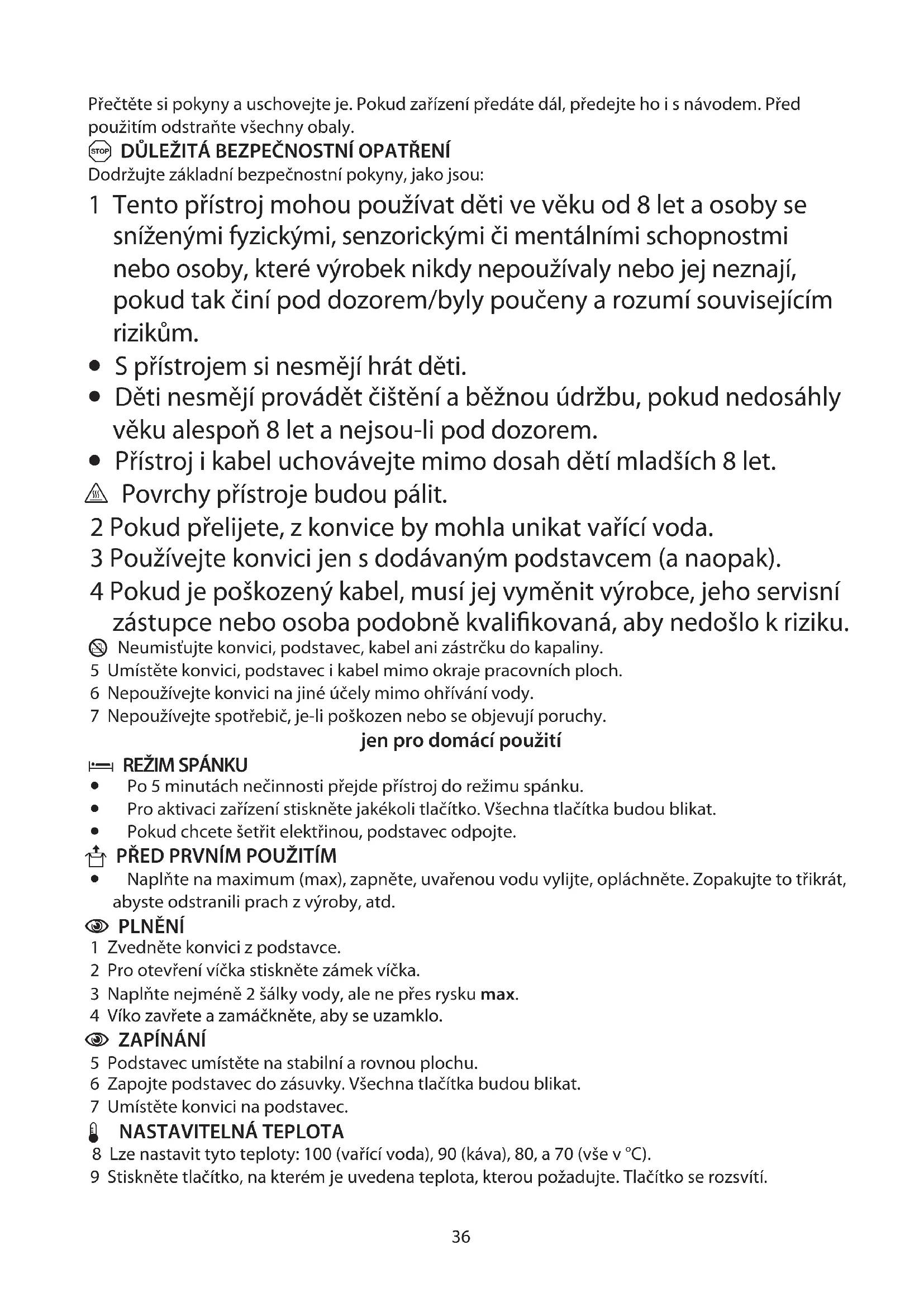 - Přístroj i kabel uchovávejte mimo dosah dětí mladších 8 let. ¬ Povrchy přístroje budou pálit. 2 Pokud přelijete, z konvice by mohla unikat vařící voda. 3 Používejte konvici jen s dodávaným podstavcem (a naopak). 4 Pokud je poškozený kabel, musí jej vyměnit výrobce, jeho servisní zástupce nebo osoba podobně kvalifikovaná, aby nedošlo k riziku. H Neumisťujte konvici, podstavec, kabel ani zástrčku do kapaliny. 5 Umístěte konvici, podstavec i kabel mimo okraje pracovních ploch. 6 Nepoužívejte konvici na jiné účely mimo ohřívání vody. 7 Nepoužívejte spotřebič, je-li poškozen nebo se objevují poruchy. jen pro domácí použití