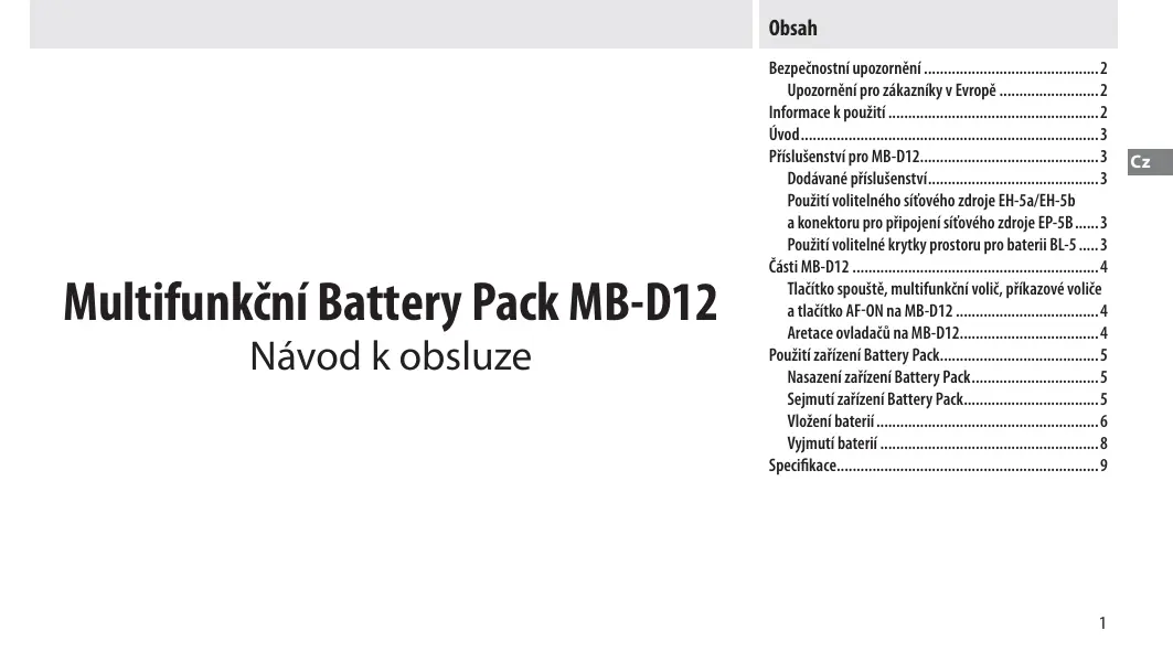 Téléchargez la notice de votre Příslušenství k fotoaparátu au format PDF gratuitement ! Retrouvez votre notice MB-12 - NIKON et reprennez votre appareil électronique en main. Sur cette page sont publiés tous les documents nécessaires à l'utilisation de votre appareil MB-12 de la marque NIKON.